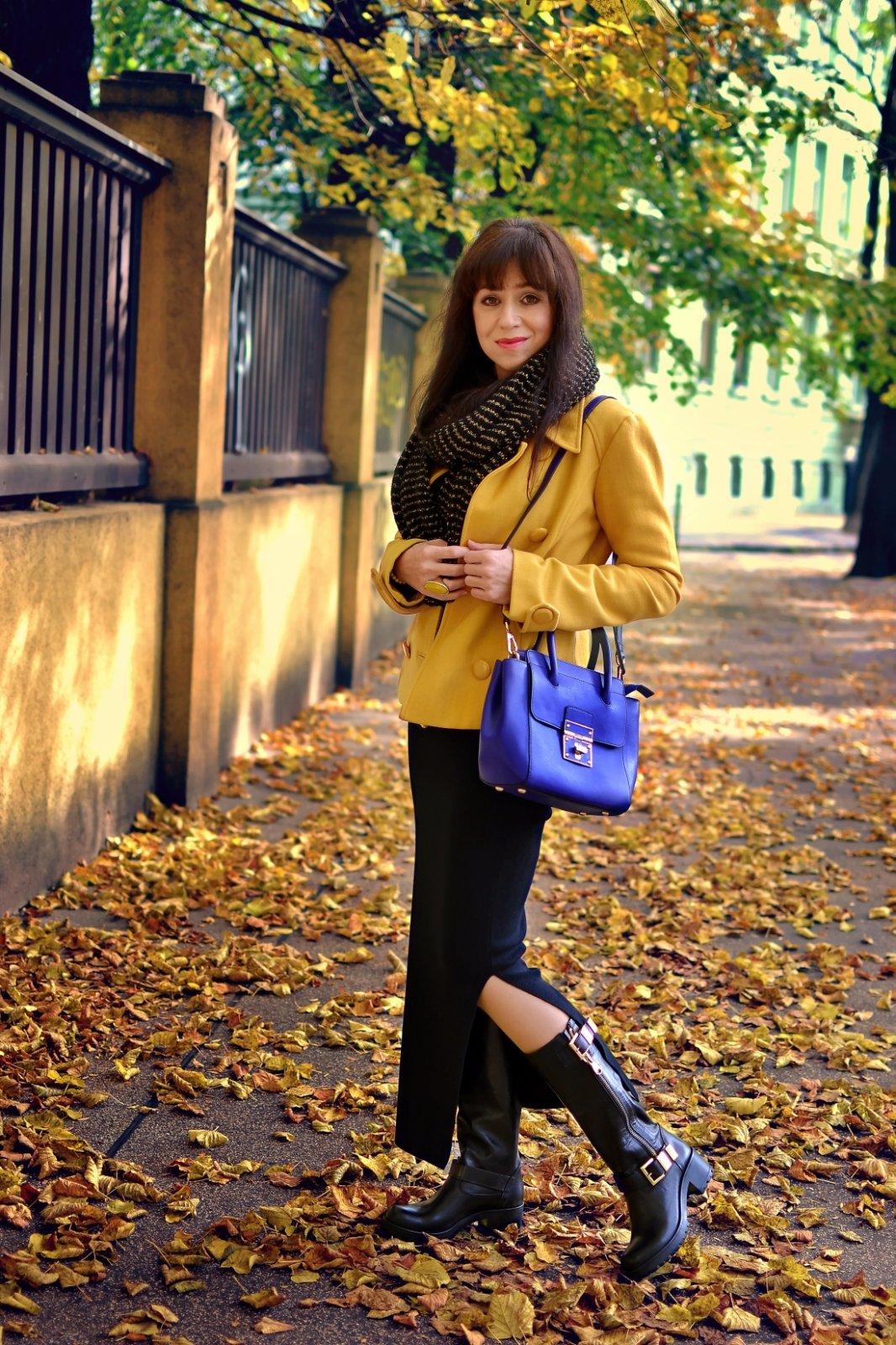 Dnes vám však ešte prinášam jeden zaujímavý outfit, kde som sa s farbami "krotila" avšak kabelka a zateplené sačko museli žiariť. 🙂