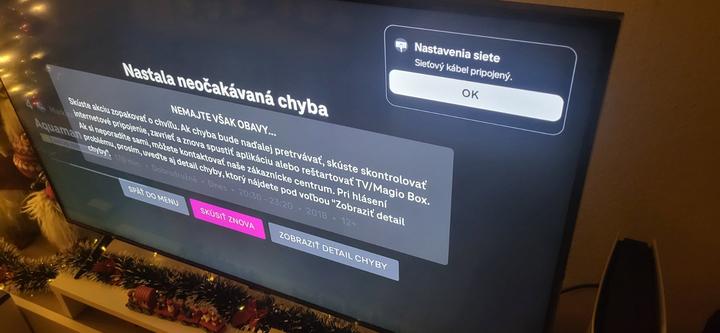 Ahojte prosim Vas baby nevyhadzuje vas telekom s internetu? Mame v podnajme optiku a teda tv je vylucne na internet. A cely vecer mi vypisuje ze kabel siete odpojeny kabel siete pripojeny uz mam toho plne zuby. Cez vianoce sme boli u priatela aj jemu to tam skocilo ale len 2 krat. Potom mi na skoci na tv toto. Neviete co to moze byt?
