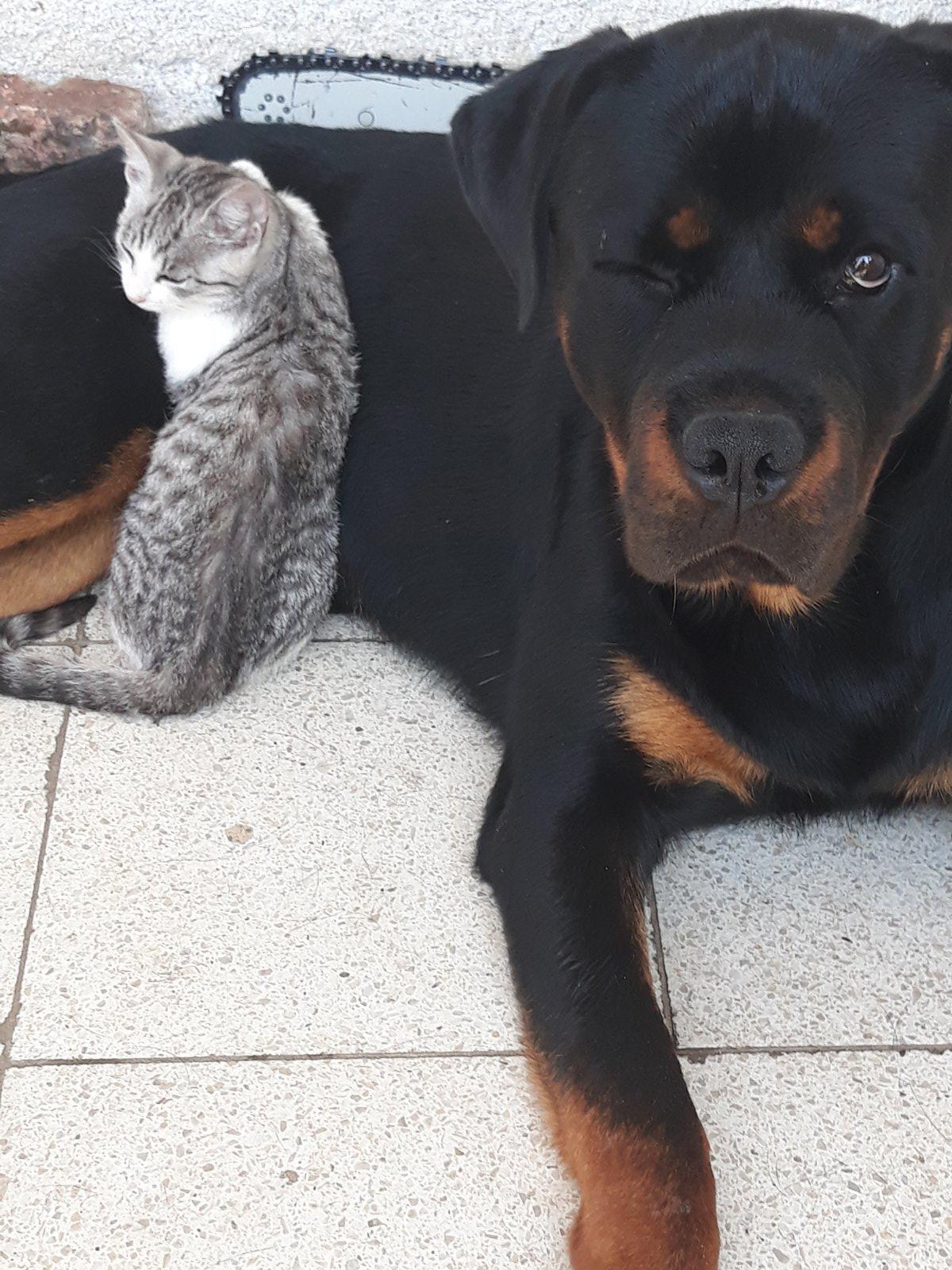 Mame miesaneho jack russela. Divil ako splaseny pokial sme domov nedoniesli kocura. Mal 4 mesiace, najprv sa od strachu pocikal, ale na druhy den rano, ked sme otvorili dvere a mali ho v rukach a pes prisiel onuchat co to mame, zaprskal na neho a zahnal sa labkou po psovi a odvtedy su kamosi 😁 pes ma kamosa, nenudi sa, kocur ked ma dost, ide sa prejst mimo zahradu, ked vencime psa, kocur chodi v ramci svojho teritória s nami 🙂 ked im je zima, spia spolu na rohozke. Su to nase trdla 🙂