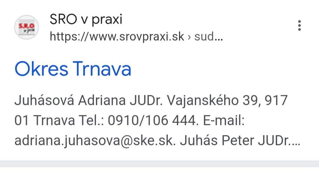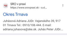 Ahojte viem zw to je ihla v kope sena ale snad motyka vystreli. Hladam telefonne cislo alebo nejaky kontakt na Judr.Adrianu Juhasovu. Nasla som email ale neodpisuje a telefonne cislo nic. Ak by ste nahodou niektora mala tefonne cislo bidem vdacna. Dakujem