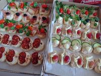 my robíme klasiku - rožok,maslo,koliesko klobásky, štvorček syra, koliesko kyslej uhorky a navrch kúštik slanej rybky...potom cesnakové-tatarská omáčka, syrokrém,cesnak...a ešte naposledy sme robili také že štvorec lístkového cesta na to koliesko klobásky, posypať strúhaným syrom a upiecť...tie zmizli ako nič 🙂