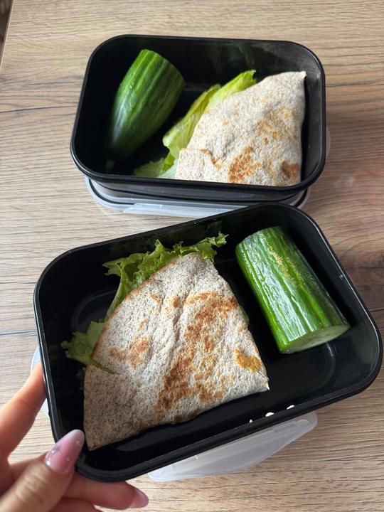 tortila, vajíčko, tofu, špenát, ľadový šalát + uhorka 🥒