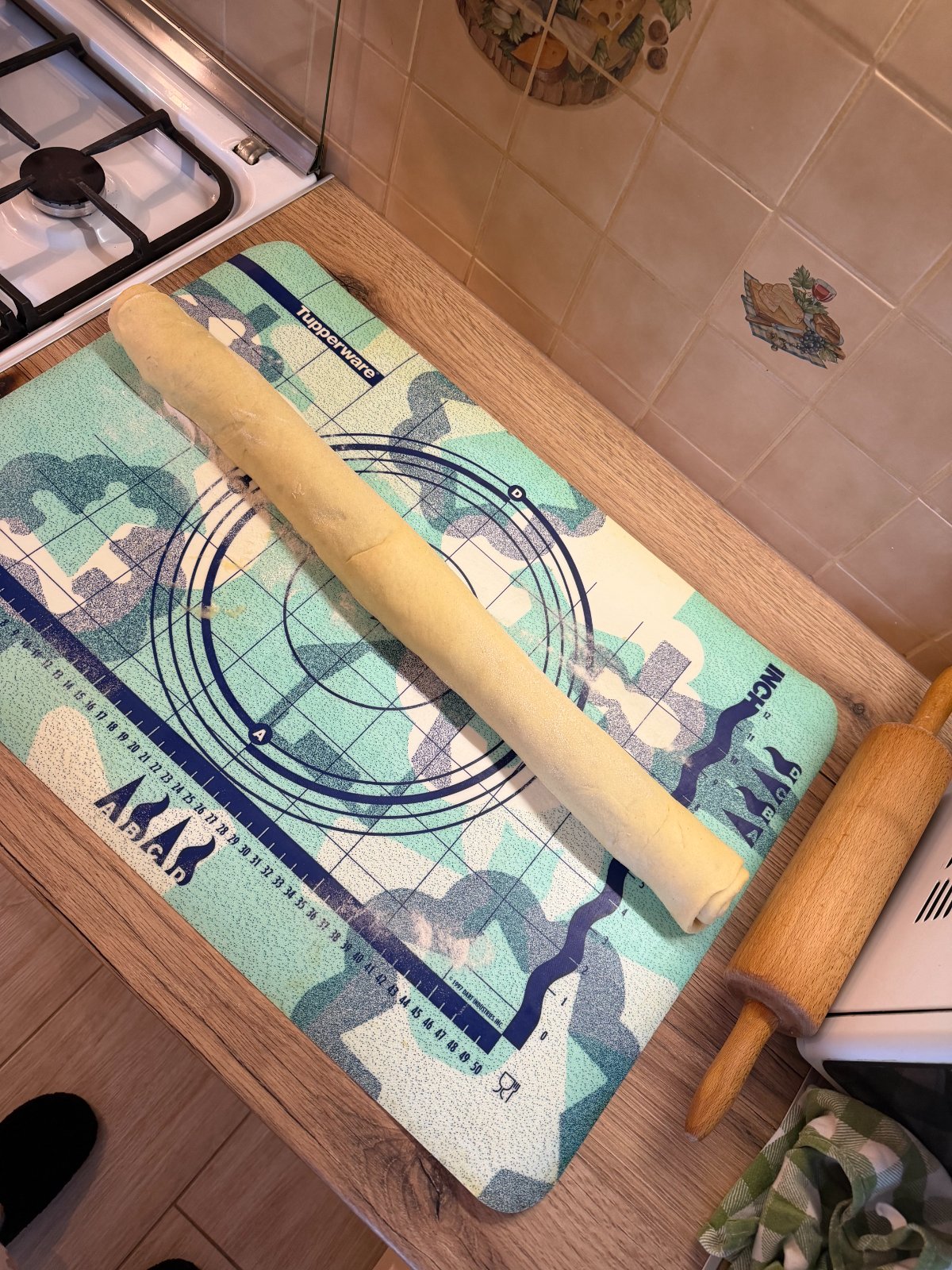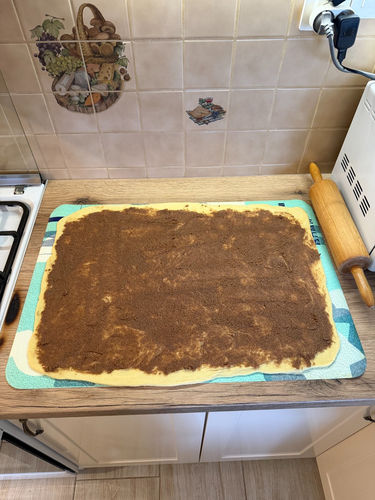 Následne vyvalkáme tenké cesto, ktoré potrieme škoricovou zmesou.