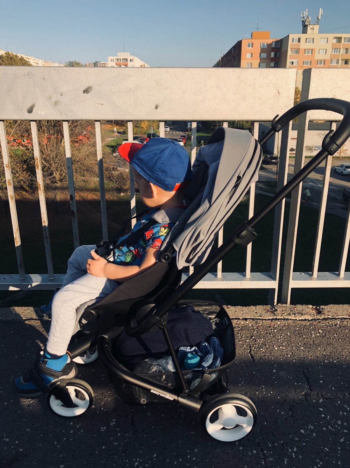 Super váha a ‘stavba tela’ ti pomôže zvládať nakladanie do auta, tlačenie hore kopcom, celkovú manipuláciu… Plusom je aj dobré ťažisko, a to v oboch smeroch. Tlačiť kočík, aj jednoručne, tak pre mňa nebol nijaký problém - a to ani napriek tomu, že najhlavnejší testovač, dva a polročný Ferdinand, nie je nijaký drobček. Takže jednou z vlastností, ktorú vďaka váhe a celkovému prevedeniu tento kočík naisto má, je “bezproblémovosť” - teda že ťa v nijakom smere nezaťaží. Je to taký malý a nenápadný, no každodenne využiteľný klenot, ktorý, ak zladíš k tvojmu životnému štýlu, bude vynikať v takmer až luxusnej pozícii. Kombinuje totiž jednoduchosť štýlu s nezapadaním do davu a krásnymi pastelmi - ten náš konkrétne neutrálne sivú s kontrastom v odlišnom tóne i štruktúre vnútornej sivej látky. Biele vnútro kolies je netradičný, no neprehnaný detail, ktorý sa mne osobne veľmi pozdáva. V tom dave strieborných či čiernych konštrukcií a kolies je to veľmi príjemná zmena.