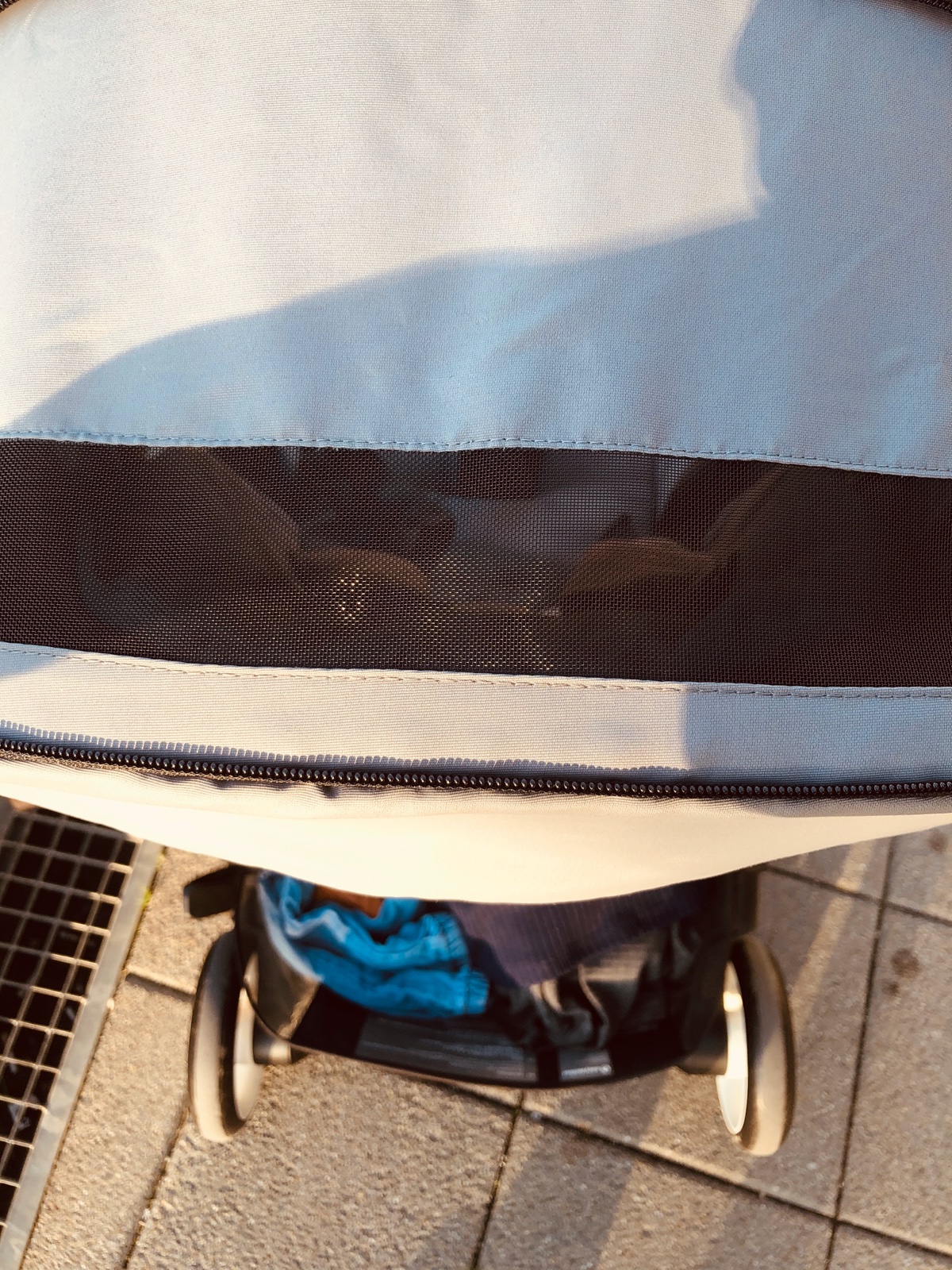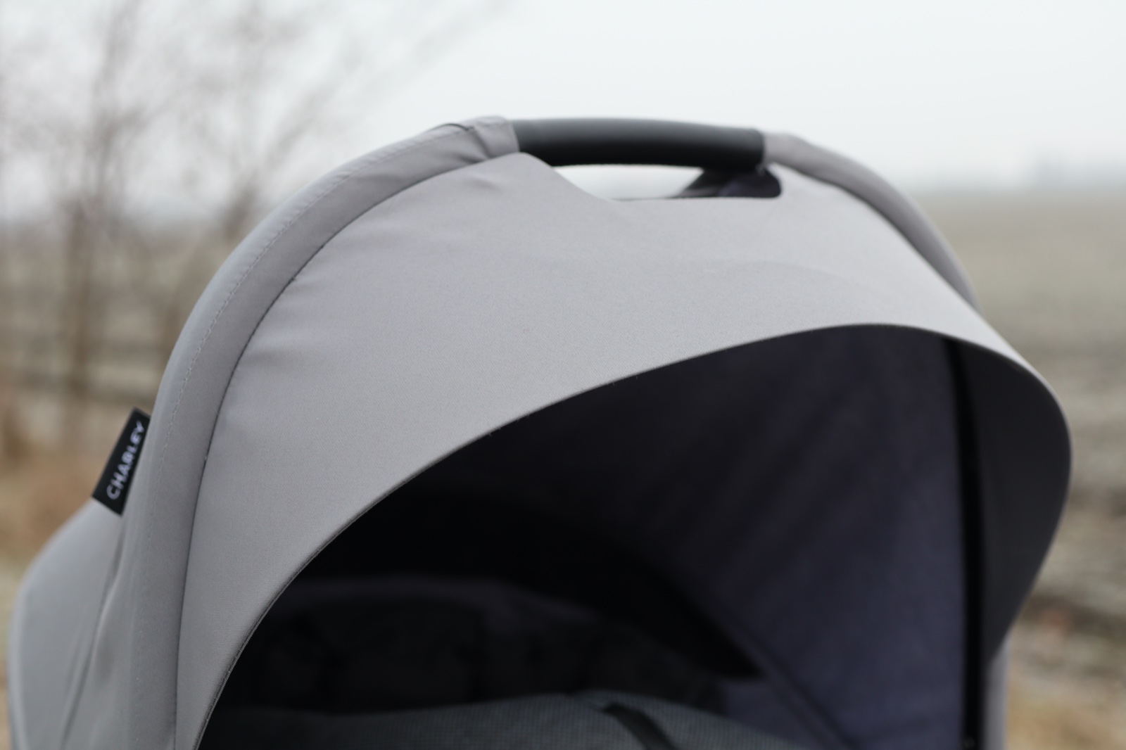 Strieška na prvý pohľad pôsobí malo - teda skôr kratšie, aspoň z fotografií. Sama som u Charley-ho rátala s menšou strieškou, ale brala som to ako daň za to, aký malý, spratný a šikovný Charley je. Prekvapila ma potom realita, kedy som si po rozložení kočíka z krabice, že strieška vlastne ani nie je krátka - je relatívne mohutná, len má netradičný tvar. V sede, po kompletnom roztiahnutí aj so šiltom, mne osobne dokonca v podstate prišla dlhá. Typicky pre kočíky, kde sa strieška hýbe spolu s opierkou pri polohovaní, je v ľahu kočík samozrejme otvorenejší, než v sede - ale stále mi strieška prišla pre typ absolútne dostatočná. Najmä kvôli super možnosti posúvať ju po sedadle na výšku, takže ak potrebuješ tieniť viac - alebo menšie dieťatko - stačí ju zasunúť čo najnižšie, aby bola čo najbližšie pri hlave. Naopak väčšie dieťatko zasa vysunutím striešky vyššie získa viac priestoru.