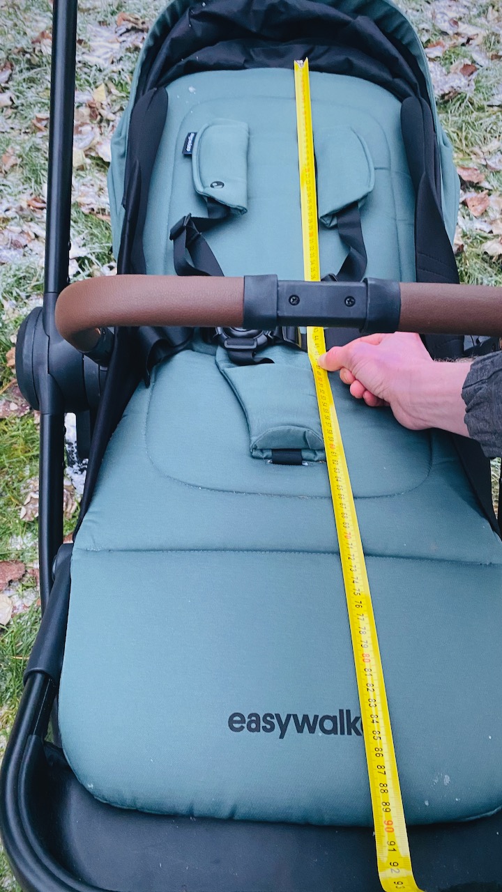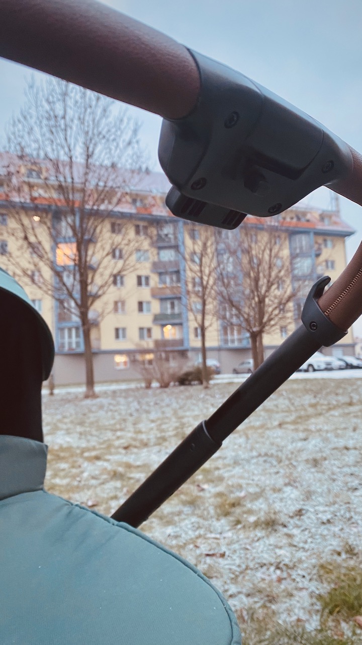 A ešte jedna dôležitá vec o rukoväti. Je pomerne vysoká, takže nič pre malinké maminky či nižších rodičov celkovo. Vyzerá, akoby mala/mohla ísť ešte nižšie, ale nejde, jej možnosti sú medzi mnou odmeranými 102, 106 a 110 cm (3 možnosti nastavenia). 110 cenntimetrová výška rukoväte v najvyššej polohe, btw, umožní kočíkovať aj naozaj vysokým tatinom, čo je dobrá správa pre manželky napr. basketbalistov 😉