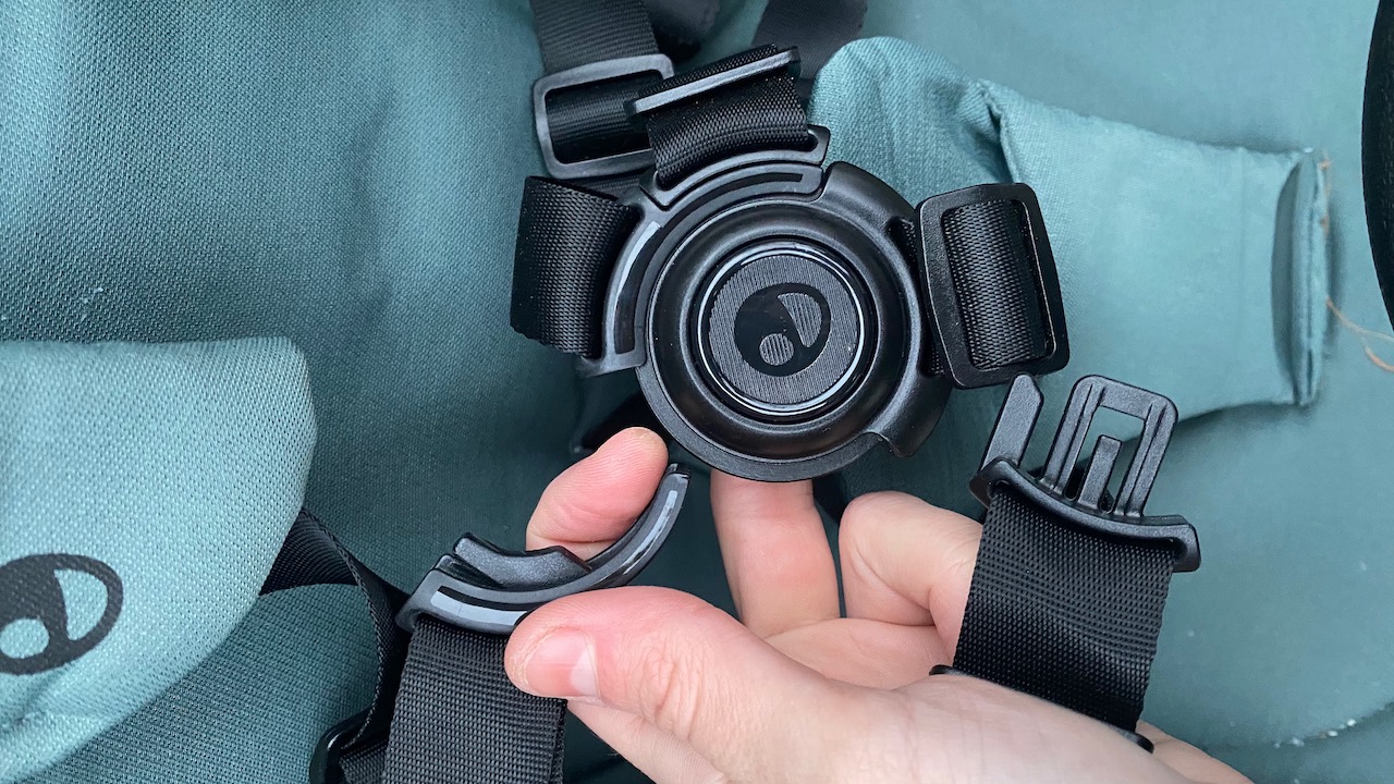 Vrchné popruhy sa puzzle systémom prevlieknu s bočnými, a tak sa zasúvajú do efektnej okrúhlej pracky. Ja osobne nemusím ten systém zapínania jeden zasuň do druhého a až potom zaklikni, pretože ak sa dieťa trepe alebo je naobliekané, ľúbi sa to vyšmyknúť - a môžeš začať znova… ale tu je to také pevnejšie, takže to nie je až taký problém. Preferovala by som každopádne buď systém, kde sú popruhy spojené alebo zaháknuteľné napevno, alebo kde sa každý popruh zaklikáva do základne - pracky samostatne. Easywalker Harvey2 v tejto oblasti každopádne oproti Rudey vedie - lebo to puzzle systémom riešené nemá. Ale to je samozrejme individuálna preferencia, a moderné kočíky akosi systém puzzle prevliekania pásov dosť preferujú.