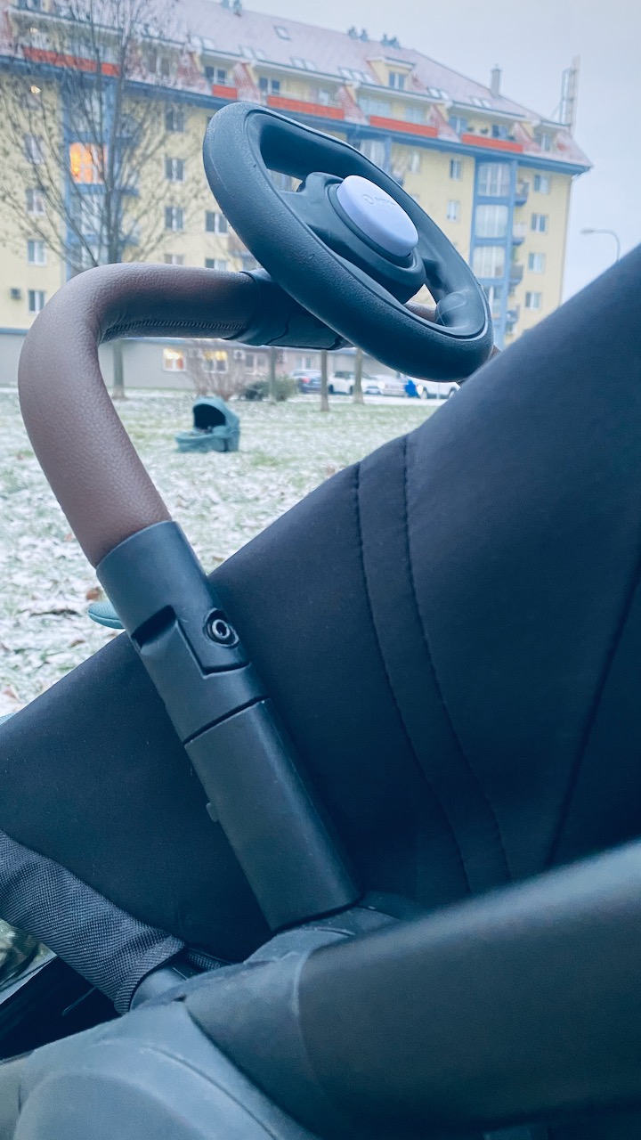 Sedadlo je samozrejme vybavené detským madlom. To je pokryté rovnakou koženkou, ako rodičovská rúčka, a takisto má v strede odnímateľný klip zakrývajúci miesto na nakliknutie voliteľných doplnkov. Naň s najväčšou pravdepodobnosťou nacvakneš detský volant, je to naozaj skvelý a môj asi top doplnok k Rudey-mu . Hlavne na začiatku jazdy si syn rád zatrúbil (mierne to píska, ale nie je to zvuk rýchleho bolenia hlavy, no worries) a volantíkom potočil. Áno, fakt ide točiť 😉, a tak príjemne to kliká - dieťa môže “šoférovať” kočík (samozrejme akože). Iná maminka mi veľmi chválila LED svetlo, čo takto nacvakáva na cestovný športový kočík Easywalker Jackey - a vidí vďaka tomu na cestu. Verím, že aj pre dieťatko to bude vzrúšo, mať “pod palcom” svietenie kočíka.
