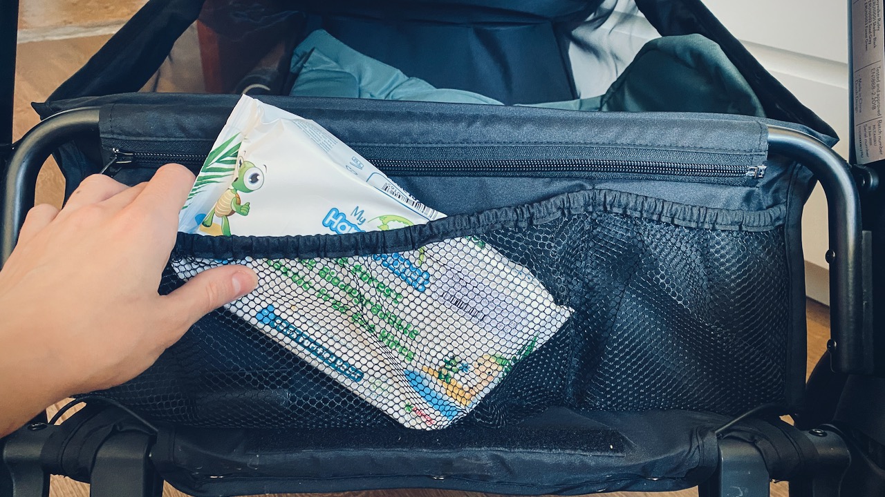 Košík na nákupy sa nedá uzatvárať, ale to je za mňa plus (zmestí sa viac vecí), a z tvojej strany na bočnici sa dá odkryť bočnica s dvoma (väčším a menším) sieťovanými vreckami na gumičku na drobnosti, vreckovky, prípadne hocičo, čo chceš mať oddelené a nestratiť. Ja som do menšieho napríklad dávala krytky na úchyty na doplnky, nech ich niekde nezaložím a nezabudnem 🙂