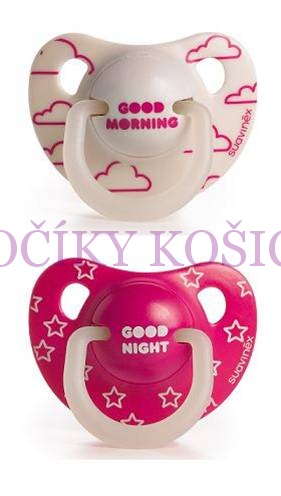 Cumlík s anatomickým tvarom vhodný už pre deti od 6 mesiacov - Duo balenie: ranné obláčiky "Good morning", večerné hviezdičky "Good night" - Nočný cumlík s krúžkom v tme žiarivo svieti - Tvar cumlíka je anatomický (zrezaný) - 0% BPA - latex - v balení 2ks