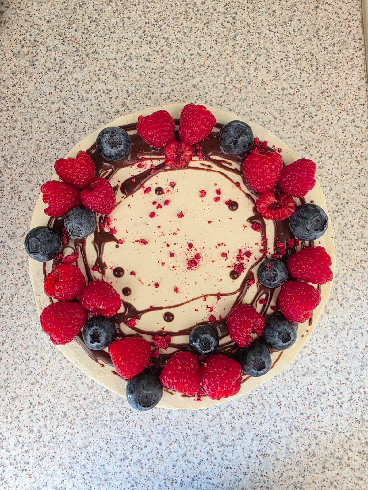 2000kg, korpus čierne kakao, mascarpone plnka s jahodovým coolies a liatou čokoládou