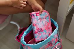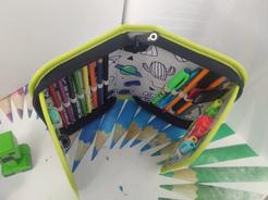 Už po prvom otvorení som si všimla, že je tam miesto na všetko. Sú tam úchyty na pastelky a fixky, tri širšie na pravítko, kružidlo či nožnice a dva na gumu či strúhadlo. Pod fóliou na vrchu je priestor na rozvrh. Zipsy sú pevné, s veľkými „ťaháčikmi“, ktoré zvládne aj malá, spočiatku neistá ruka prváka. Odolajú však aj chvatnému zatváraniu starších “ročníkov”. Veľmi sa mi páči nápad, spraviť podšívku, ktorú si môže dieťa vyfarbiť. Je to kreatívne, nápadité a určite to poteší každé dieťa. Páči sa mi, že je v rovnakom dizajne ako školská taška. Všetko krásne spolu ladí.
