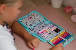 Je to jednokomorový peračník s dvomi chlopňami, takže všetko má svoje miesto a nič sa nepovaľuje. Vo vnútri je 21 gumičiek na pastelky a fixky, tri širšie úchyty na pravítko alebo nožnice a dva na gumu či strúhadlo. Dcéra si rýchlo zvykla, že presne vie, kam čo patrí. Pod jednou chlopňou je navyše priehľadné vrecko na rozvrh hodín, takže má prehľad o každom dni.