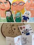 Moja dcerka ma 8.rokov. Velmi rada tvori a miluje kone, ktore su vacsinou predmetom jej tvorenia. Vybrala som jej dielka, ktore patria k mojim oblubenym...portret nasej rodiny a my ako ponozkove manusky.....a knizky o konikoch s drevenym podnosom(ktory robila s vypalovackou na drevo). Jej oblubene farby su modra a oranzova.