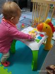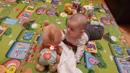 Náš Rudko má 9,5 mesiaca. V tejto dobe ho zaujímajú hlavne hračky , ktoré si môže strčiť do úst a podľa všetkého chutia všetky hračky fantasticky. A ešte lepšie sú také, čo hrajú a samozrejme blikajú. Podotýkam čím farebnejšie tým lepšie . Najradšej má keď si spolu spievame (mama s tatom spieva ) a tancujeme samozrejme u mami na rukách, ale zábava najväčšia. Radi by sme sa zúčastnili testovania. Z Fisher Price máme hrací stolík. Zatiaľ používame bez nožičiek ako hrací panel .