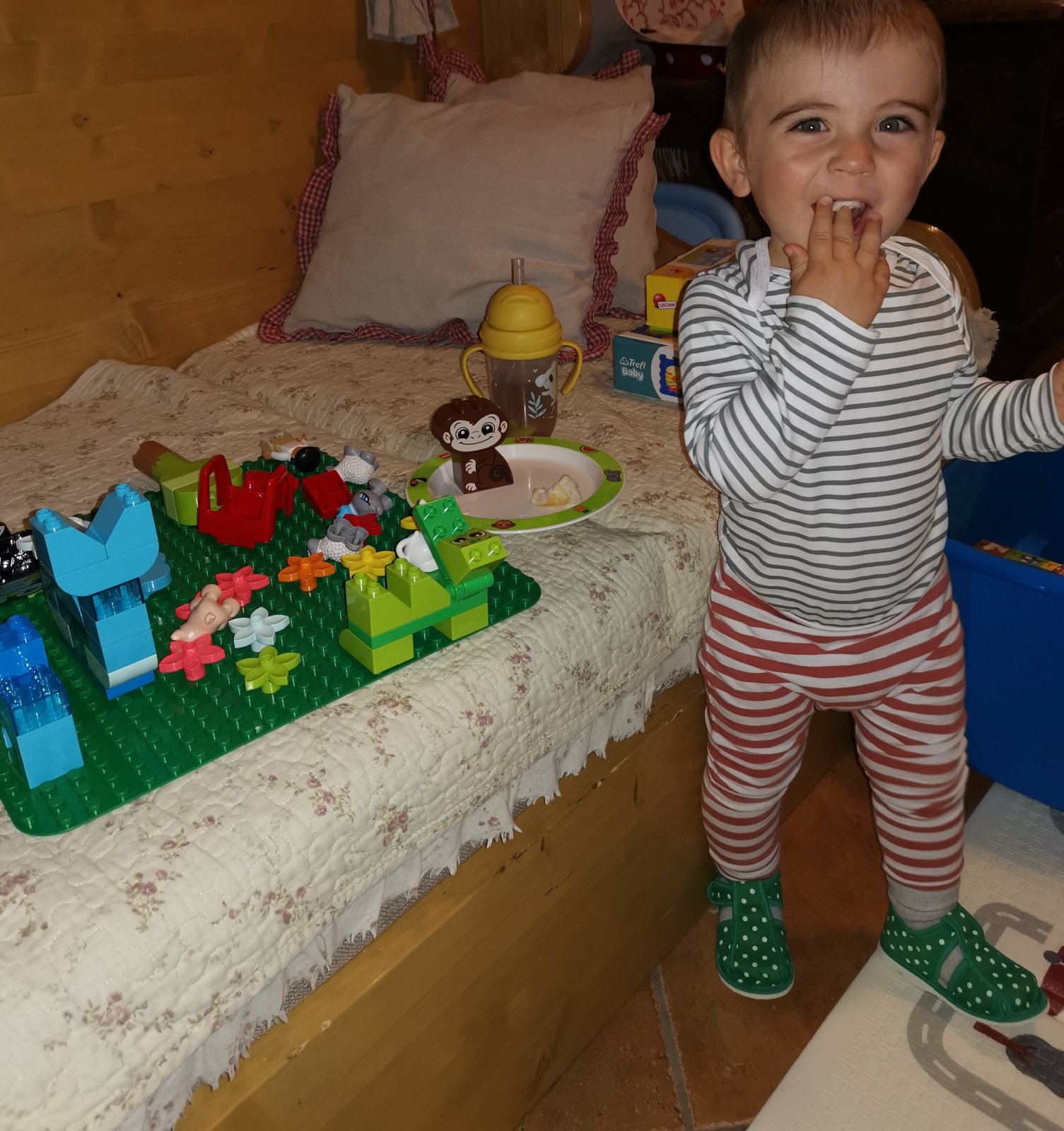 Náš čoskoro dvojročný zbojník miluje šmýkačky, hrabanie sa v drobných kamienkoch či piesku, keď sa však nedá byť vonku, stavia so staršími súrodencami veže, ohrady pre dinosaury, parkovisko pre autá či farmu. Lego Duplo má u našich troch detí úspech už 13 rokov a práve prežívame comeback u tohto najmladšieho😉