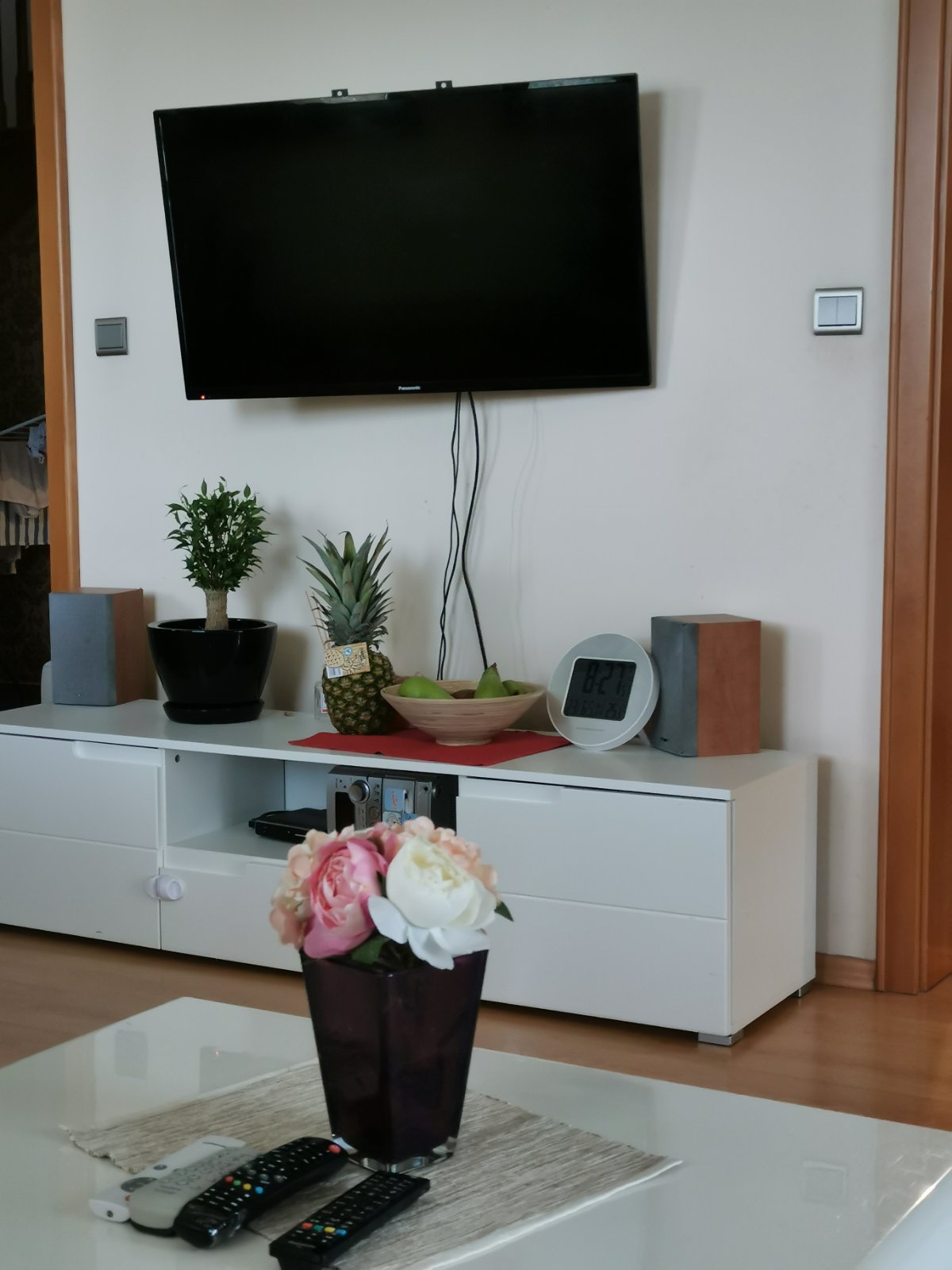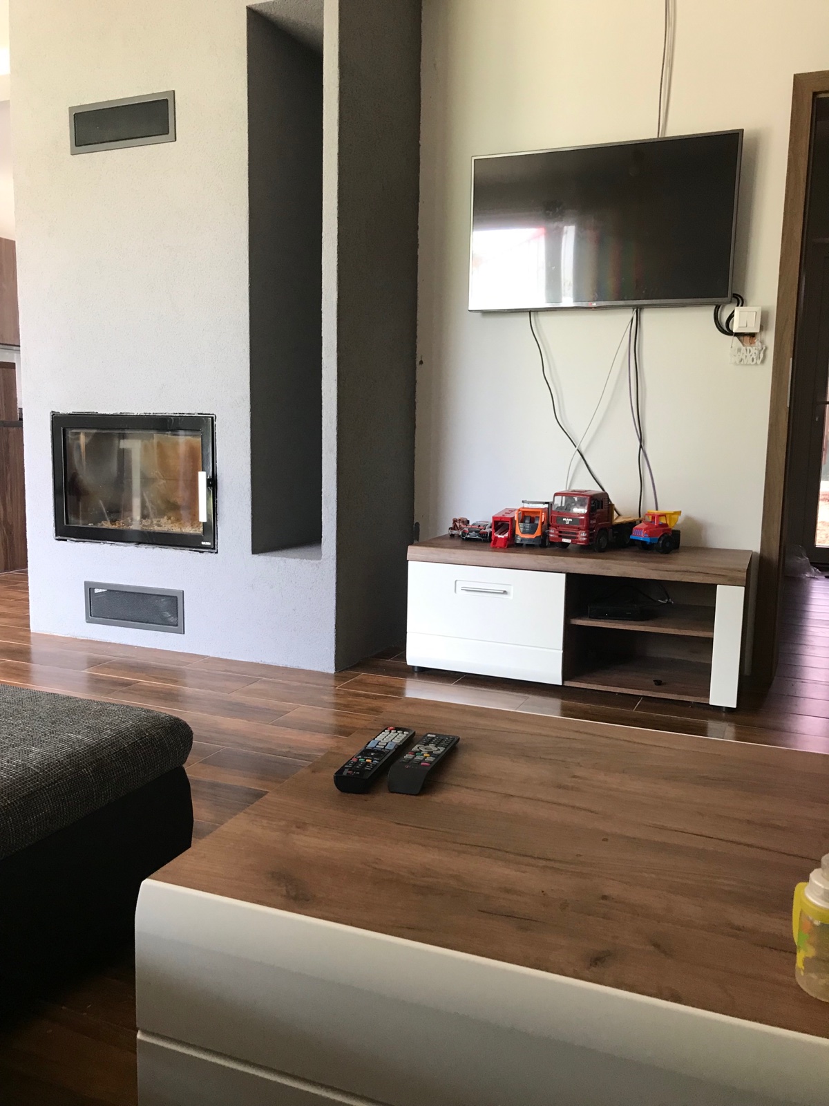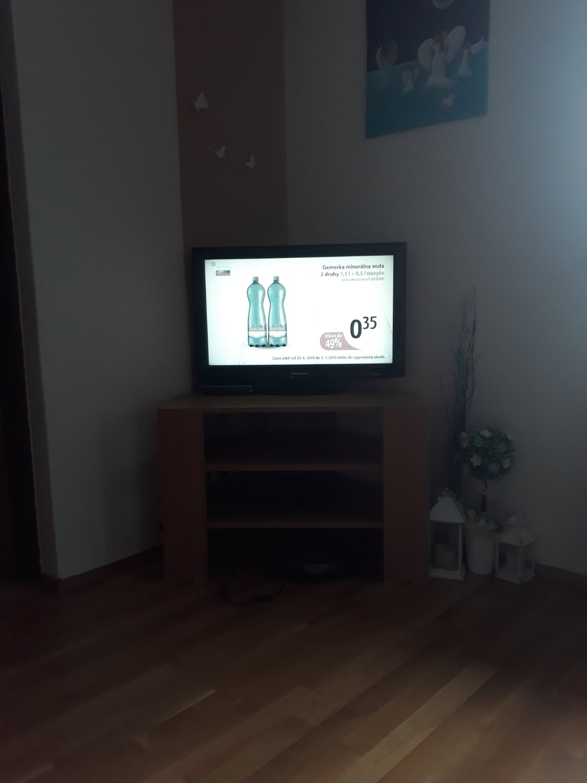 @charlinka111 TV je samozrejme zavesená na stene s nastaviteľným stojanom, aby sme ju mohli využívať aj z kuchyne a terasy 🙂