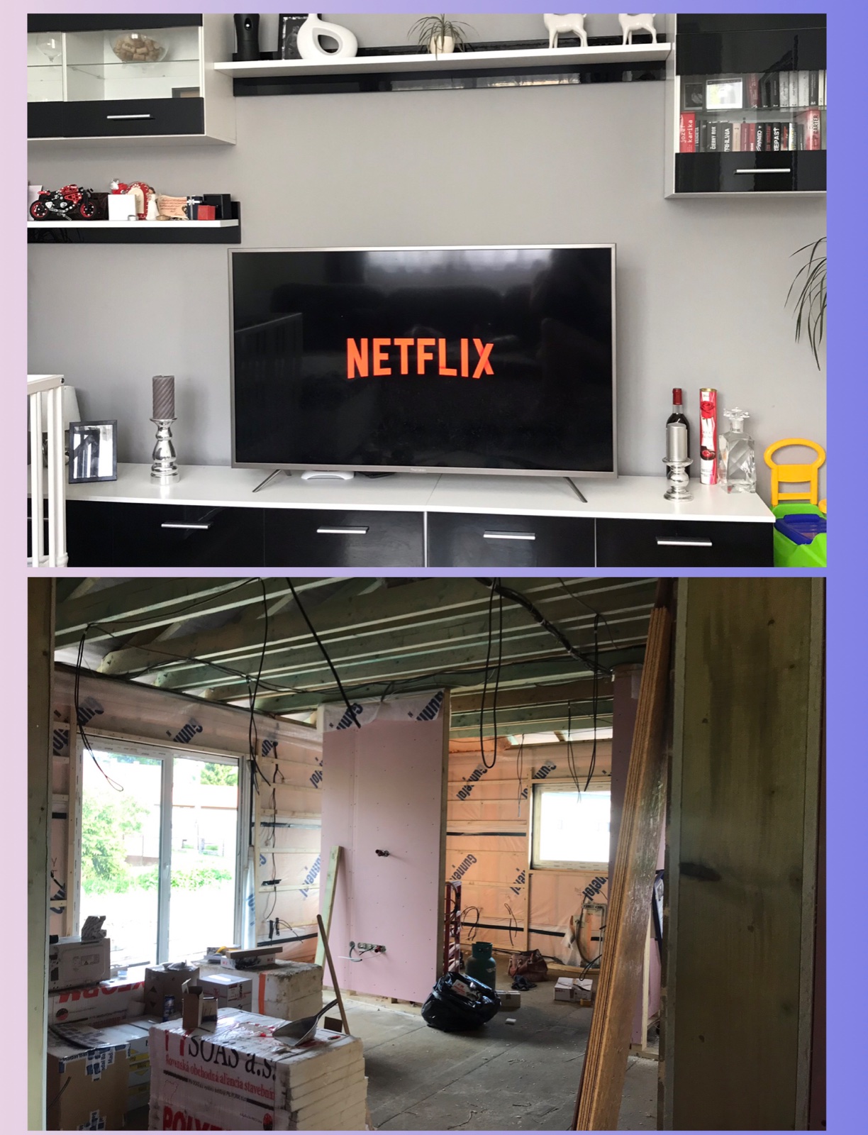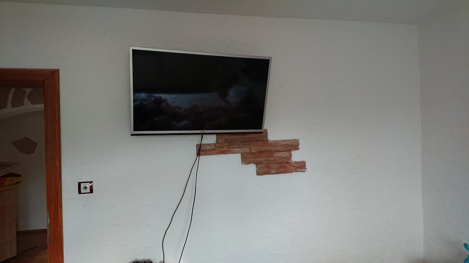 Aj keď ešte nemáne gauč a skrinku pod TV a podlaha sa tiež bude meniť, tak moj neskutočne šikovný manžel ako prvé vymyslel toto super uloženie TV tak aby nás pri sledovaní absolútne NIČ nerušilo kedže hned vybúral stenu a do nej vkladal rúrku s káblami ktoré sú bezpečne a nenápadne uložené aby nám nerušili celkový dojem pri sledovaní TV.