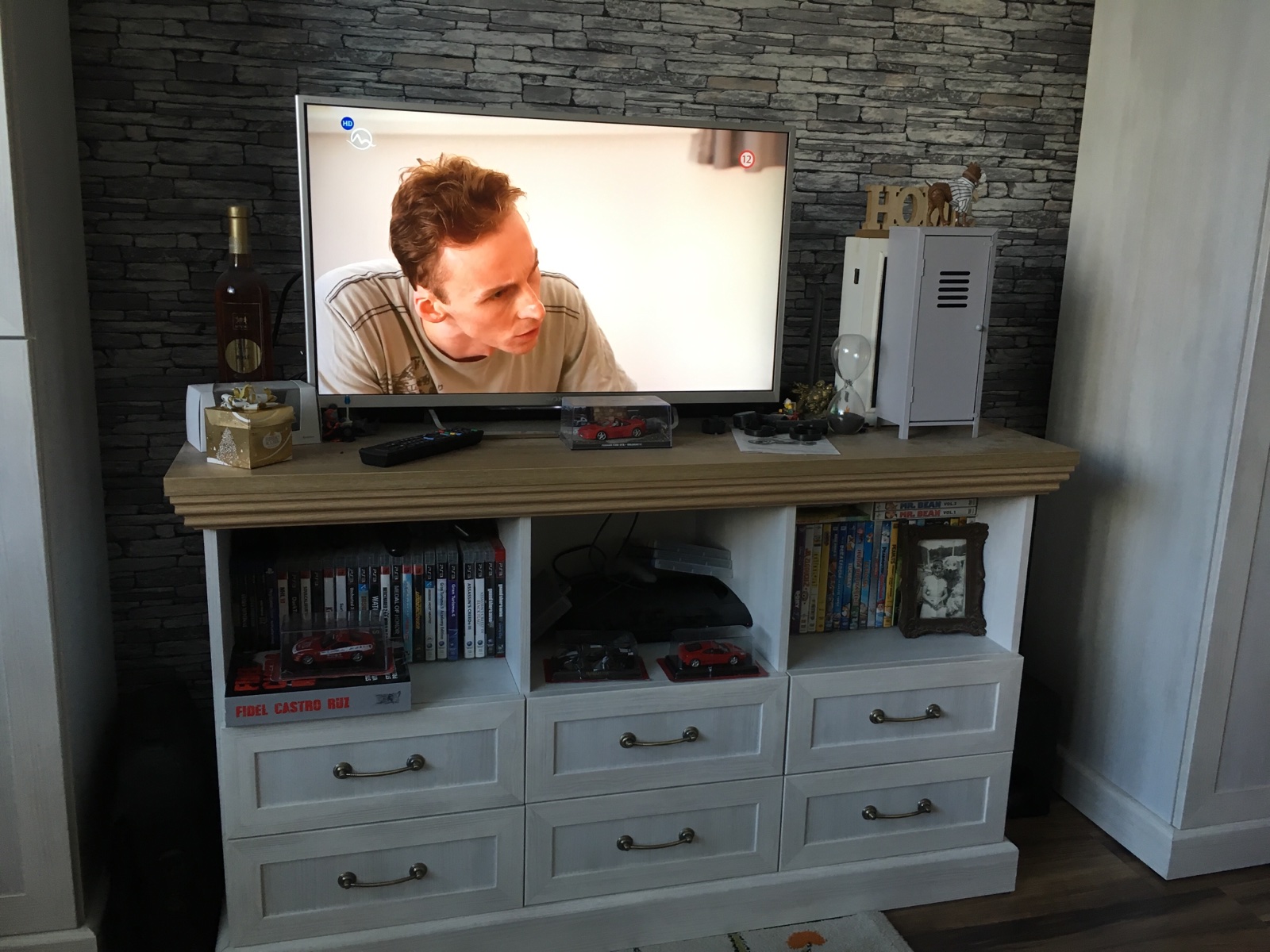 Naše súčasné tv máme zavesené na stene ,aj kvôli bezpečnosti a aj kvôli tomu aby sa lepšie naň pozeralo.U nás sa tv sleduje od rána do večera,ráno môj menší syn pred odchodom do škôlky rád pozrie rozprávku,ja počas dňa keď som sama a drobcom rada si pozriem nejaký ten magazín pre mamičky,po príchode starších detí tv je obsadené ,oni radi pozrú rôzne videá na you tube kanáli alebo si hrajú hry na konzole, neskôr prichádza domov nás ocko on je zas zástancom dokumentárnych a prirodopisnych kanálov a večer je ovládač konečne môj ,rada si pozriem nejaký film alebo serial.
