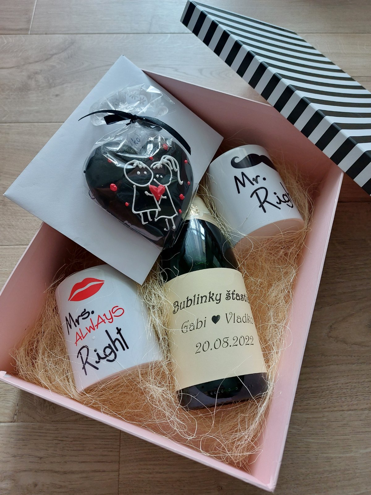 autor@miskaleonorbi nie nie, sama som vyskladala. Krabica Teddy, fľaša klasika šampus 🍾 len som si vytlačila etiketu, šálky objednané z netu a perníkové 🖤 kúpené na jarmoku