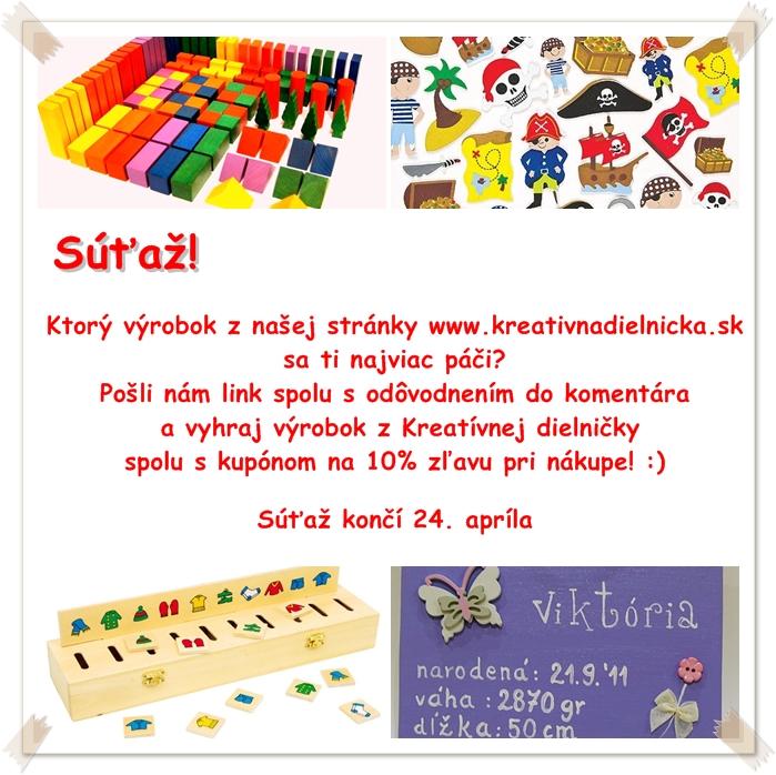 Milí rodičia a priatelia, na našej fcb stránke http://www.facebook.com/kreativnadielnicka sme pre vás pripravili anketu. V piatok jedného z vás vyberieme a odmeníme milým darčekom z Kreatívnej dielničky 🙂 Krásny jarný týždeň prajeme!!!