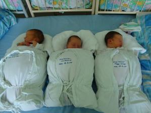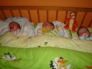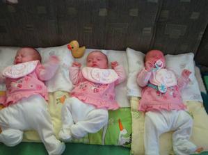 Dna 24.3.2009 sa nam narodili nase babulky krasne trojicky Paulinka, Danielka a Julianka. Cele tehotenstvo som ako rizikovka stravila v nemocnici. Na zaciatku tehotenstva som bola v Brezne a potom do konca v Banskej Bystrici, kde babulky aj v 33/4 tt. prisli na svet. Otehotnela som prirodzenou cestou, takze sme boli pre BB raritou. Prva prisla na svet 10 min. po polnoci Paulinka, vazila 1810g a merala 46 cm, druha sa prihlasila strasnym krikom 11 min. po polnoci Julianka 1770 g a 44 cm a posledna Danielka 12 min. po polnoci - 1790 g a 45 cm.