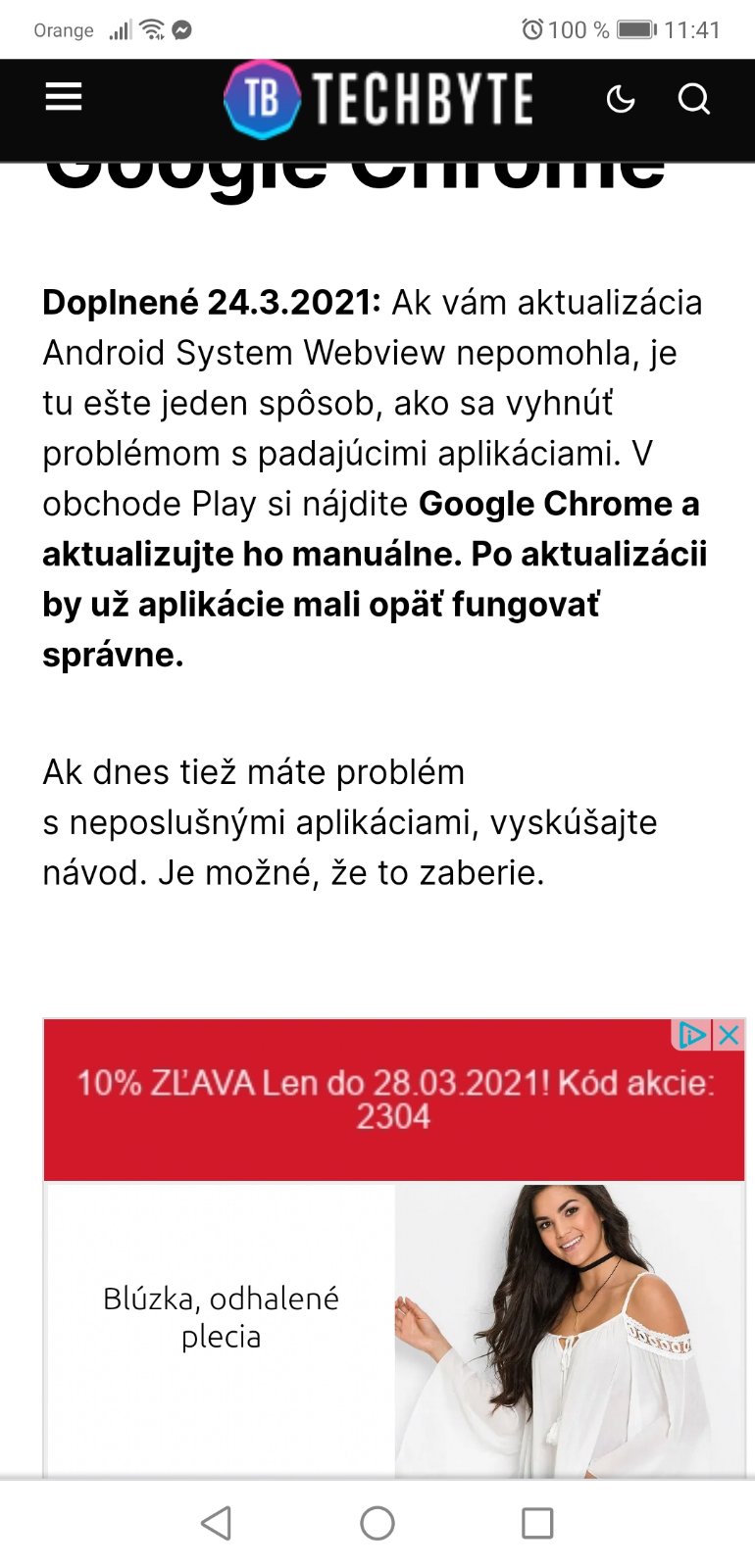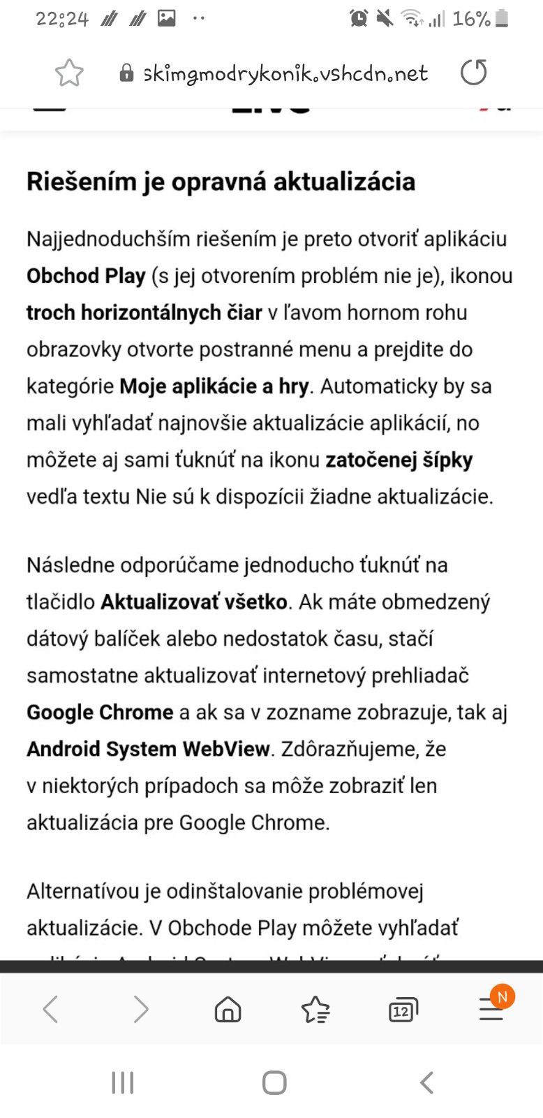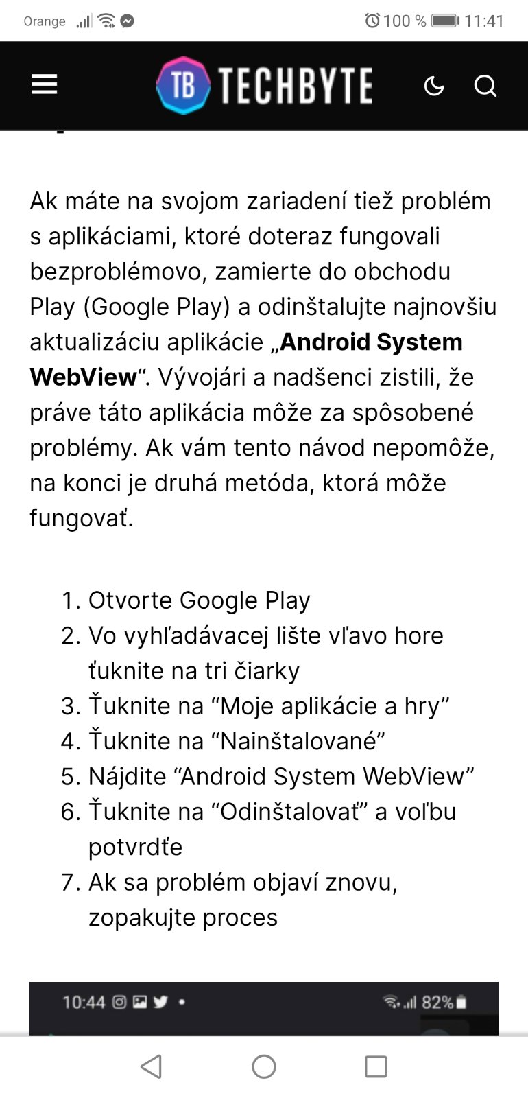 ak ste ešte neaktualizovali opravené systémové aplikácie, spomínané v článkoch - android system webview a google chrome, alebo všetky aplikácie, tak to spravte a prípadne aj reštartujte telefón, ak zmeny bez toho nechce zobrať a stále robia aplikácie problém. Po tomto by to malo ísť.