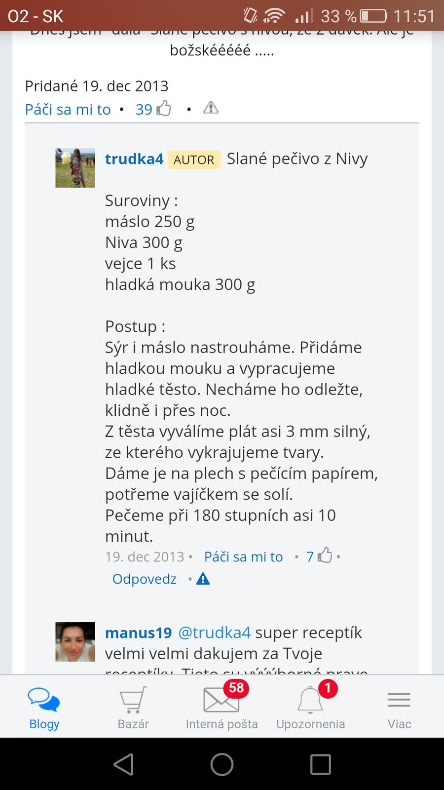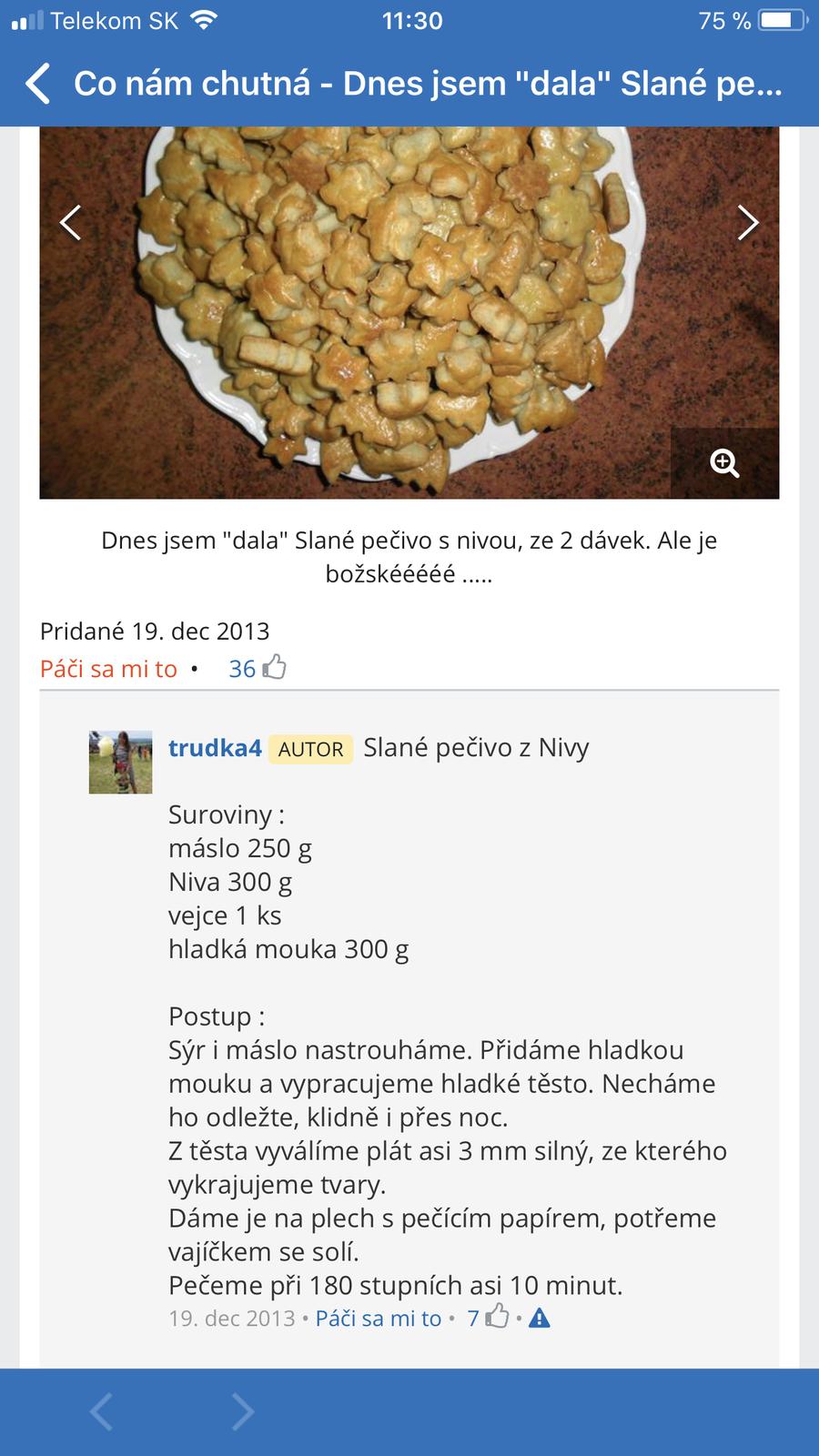 Kocky v sobotu som tu zahladla niekde recept na vynikajuce slane kolaciky z nivy. Aj som ich hned skusala piect z polovicnej davky sle trubka som si neulozila recept ☹ teraz ho hladam a nemozem nikde najst ☹ isla tam len niva maslo a muka ... nemate niektora ulozeny? Dakujem