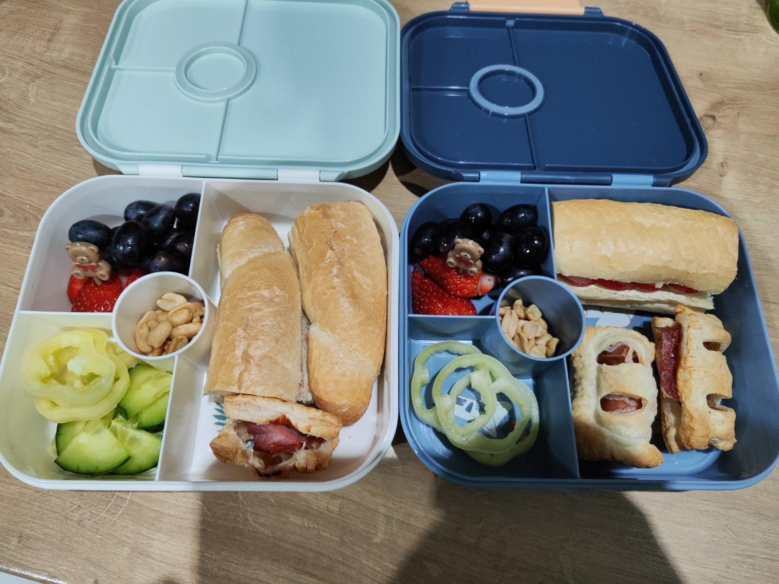 Pravy box: rozok s maslom a redkovkou,paprika,arasidy,jahody,hrozno,listkove cesto s krcupom a parkom🙂