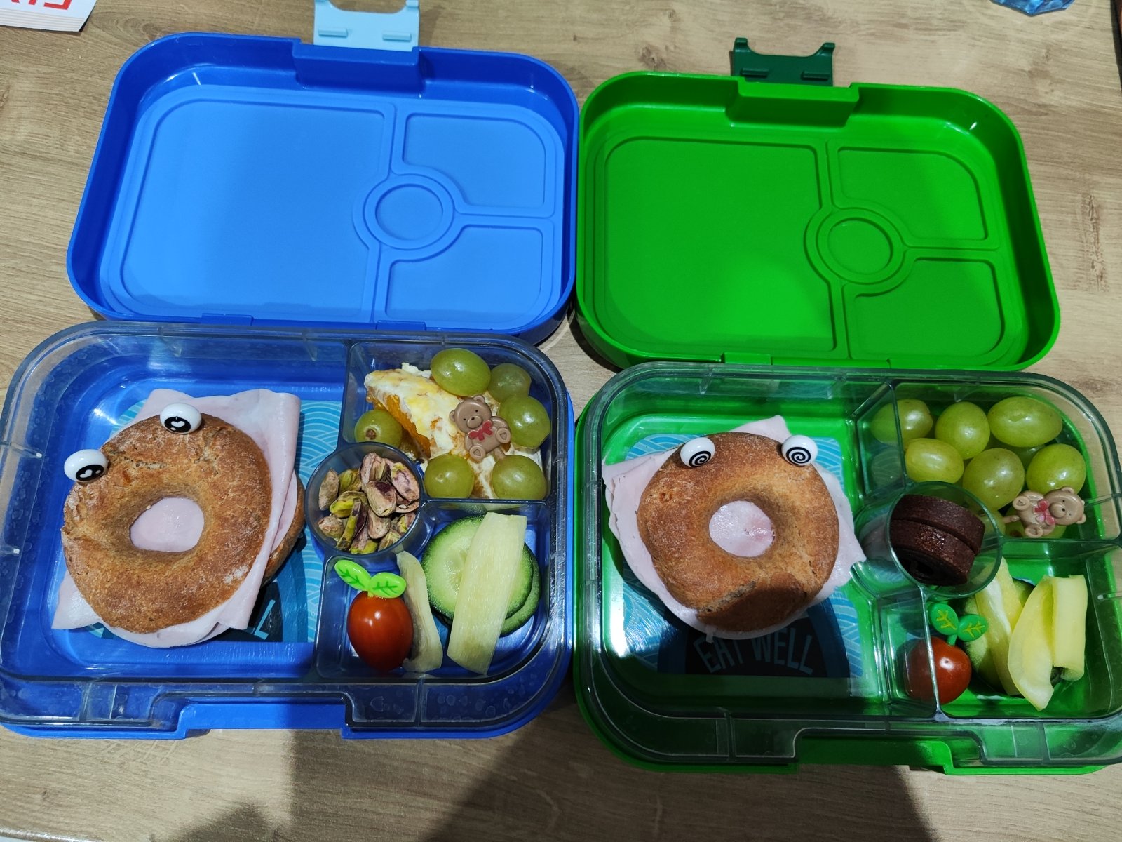 Domaci ,,bagel,, z cottage s kecupom/maslom,sunkou. Pistacie/ovocna koza,hrozno,pomaranc,rajcina,uhorka,paprika🙂