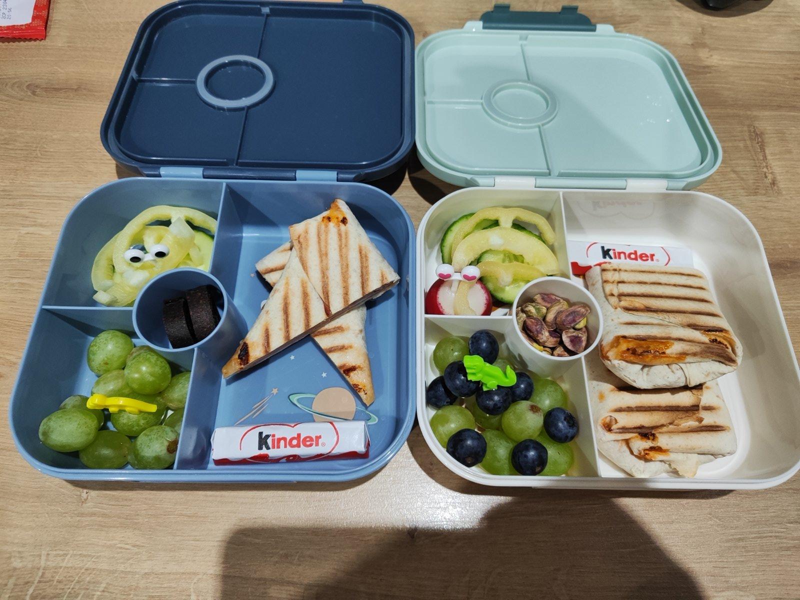 Zapecena tortila s kecupom,sunkou a syrom. Postacie,ovocna koza,hrozno,cucoriedky,paprika,uhorka,redkovka,kinder tycinka🙂