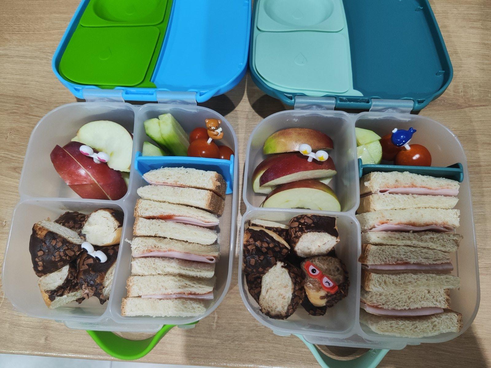 Tousty s kecupom,sunkou a syrom(rano zapeciem),donut,jablko,uhorka,paradajky🙂