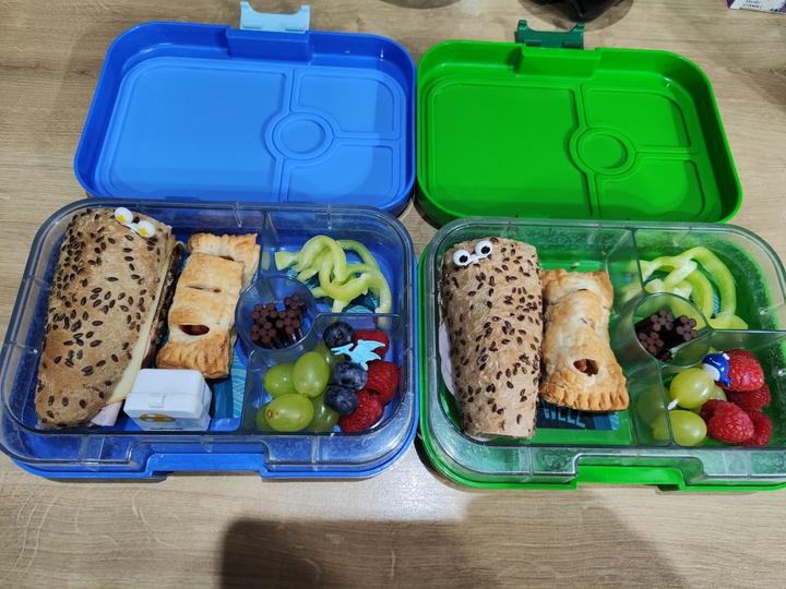 Rustikal rozok s maslom( druhy syn s kecupom),sunkou,udenym eidamom. Parok v listkovom ceste,v dozicke ma jeden syn kesu oriesky, paprika,hrozno,maliny,cucoriedky, susena ovocna koza v tvare ,,valcekov,,🙂
