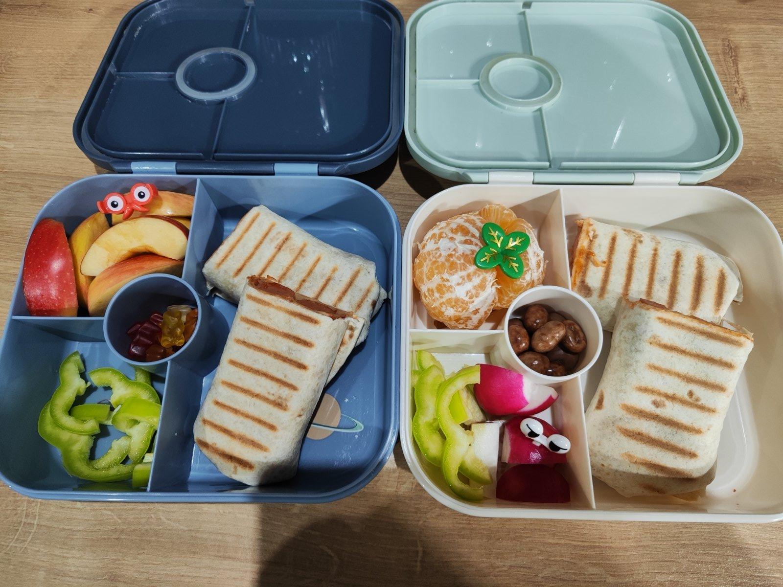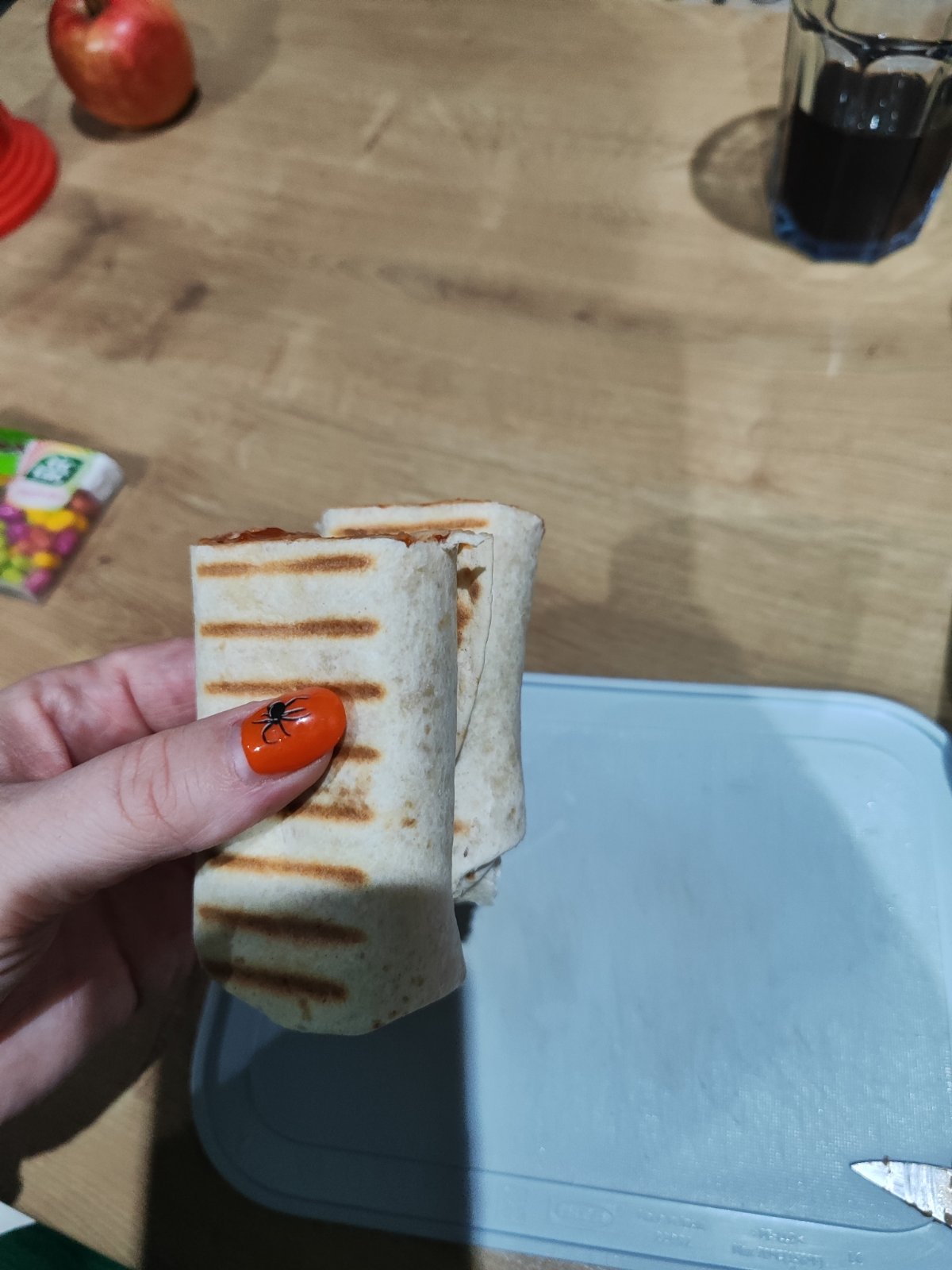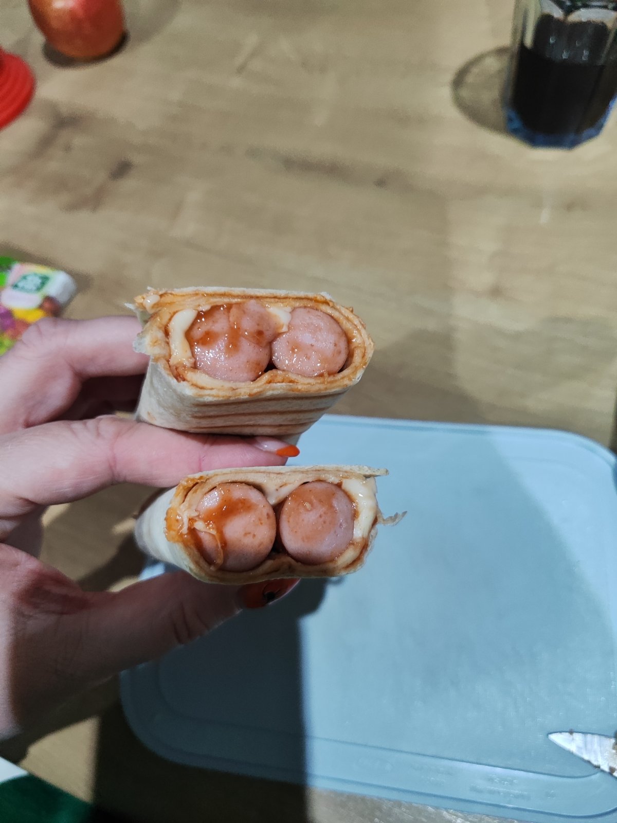 Zapecena tortila s krcupom syrom a parkom,paprika,redkovka,jablko,mandarinka,gumovy mackovia,oriesky v cokolade🙂