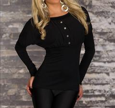 Extra top s dlhým rukávom v čiernej farbe alebo bielej. Hore je voľnejšie a elegantné a zdobia ho štyri zlaté gombíky Na brušku sa Ti prispôsobí.