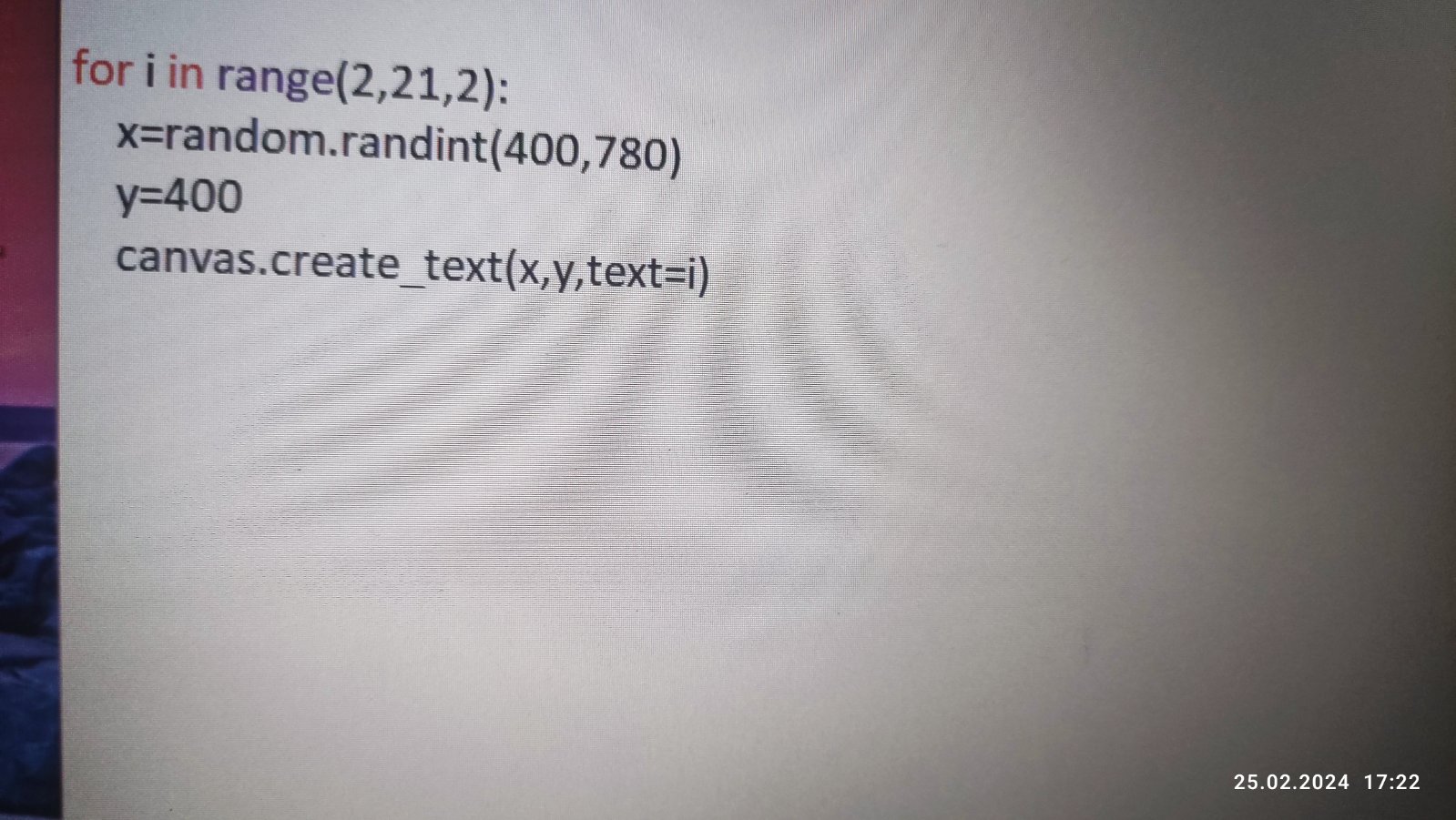 @jendralka áno brali sme no aj keď som googlila tak mi vyšlo for i in range(2,21,2):print...no my v škole print nepoužívame ale canvas.create_ podľa toho čo potrebujeme vykresliť