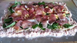Mleté mäsko (500g) som okorenila, osolila a pridala som 125ml sladkej smotany a trochu tymiánu. Všetko som zmiešala a nechala cez noc v chladničke. Potom som na alobal rozložila mäsko, nastrúhala naň syr, pridala praženicu z troch vajec a červenej papriky, schwarzwaldskú šunku, a špenát. Zrolovala som to a piekla na 200 stupňov cca 50 minút. Mrkvu, batáty, zeler, cuketu, papriku, brokolicu a cibuľu som nakrájala, pridala som trochu masla a piekla v trúbe cca 40 minút. Zeleninku nesolím a nekorením, lebo pri pečení vynikne jej chuť. Rozbalené to vyzeralo asi takto.