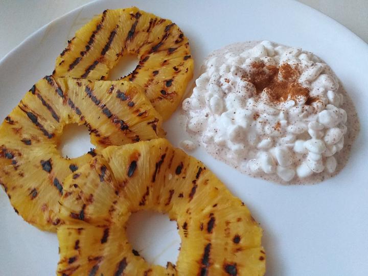 Grilovaný ananás s cottage cheesse, ktorý som ochutila škoricou a medom 👍 mňam