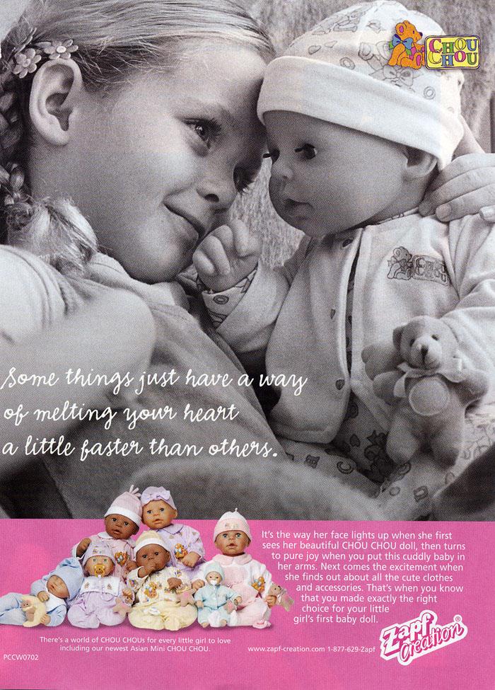 My máme Chou-chou - bábätko. Ale nie hovoriacu, len takú, čo plače, smeje sa a mrnká atď. Úprimne? Ide nám všetkým, aj dcére, na nervy. Keď je vypnutá, je v pohode, akurát mne prekáža, že keď je vypnutá, ani len tými očami nehýbe (buď je vypnutá v polohe "oči otvorené", alebo "oči zatvorené"). Dcére vadí, že vlastne tá bábika jej akoby nariaďovala, čo má s ňou robiť (keď je zapnutá) - že sa s ňou nemôže hrať podľa seba.
