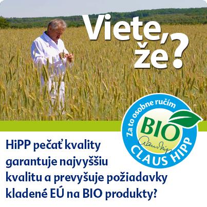 BIO není pro společnost HiPP jen nálepka na obalu. Kvalitu našich výrobků bereme velmi vážně, a tak jsme vytvořili vlastní přísný standard HiPP BIO pečeť kvality, který zaručuje, že naše příkrmy neobsahují vůbec žádné škodlivé látky. Pravidla pro získání HiPP BIO pečeti kvality jsou dokonce ještě přísnější, než jaké ukládají slovenské i evropské zákony. Více: http://goo.gl/bMaKu2