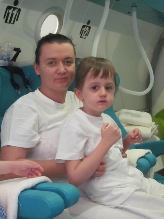 Hyperbaricka komora-Takto sedime kazdy den 75minut.Evelinke to velmi pomaha.