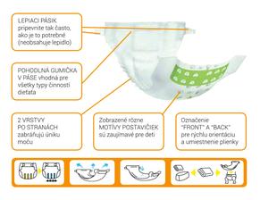 Detská pokožka je veľmi citlivá. Toto je dôvod, prečo je potrebné používať mäkký materiál pre každú časť, ktorá sa dotýka pleti dieťaťa. Ďalej je potrebná cirkulácia vzduchu cez netkanú textíliu, ktorá sa dotýka pokožky v spodnej časti – inak hrozí jej zaparenie. Vzhľadom na vzdušnosť plienky sa moč rýchlo absorbuje a vlnité pásiky nepoškodzujú detskú pokožku.