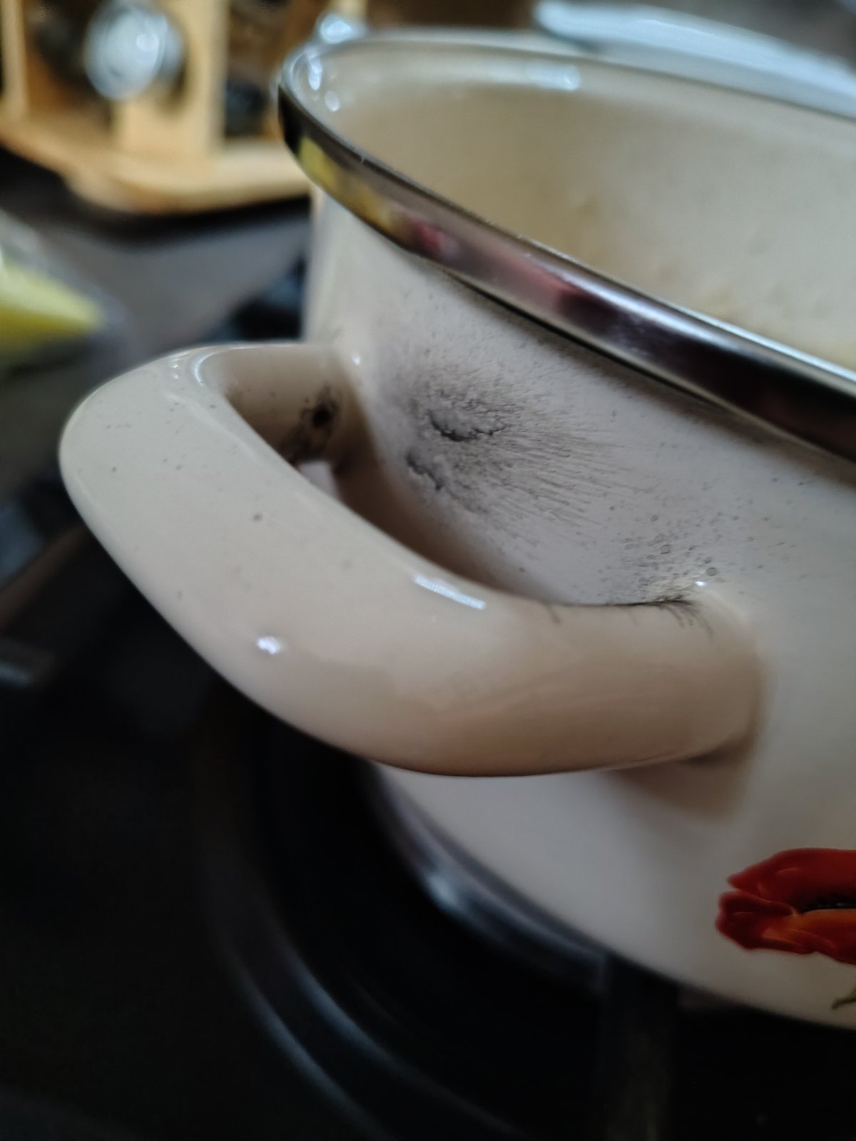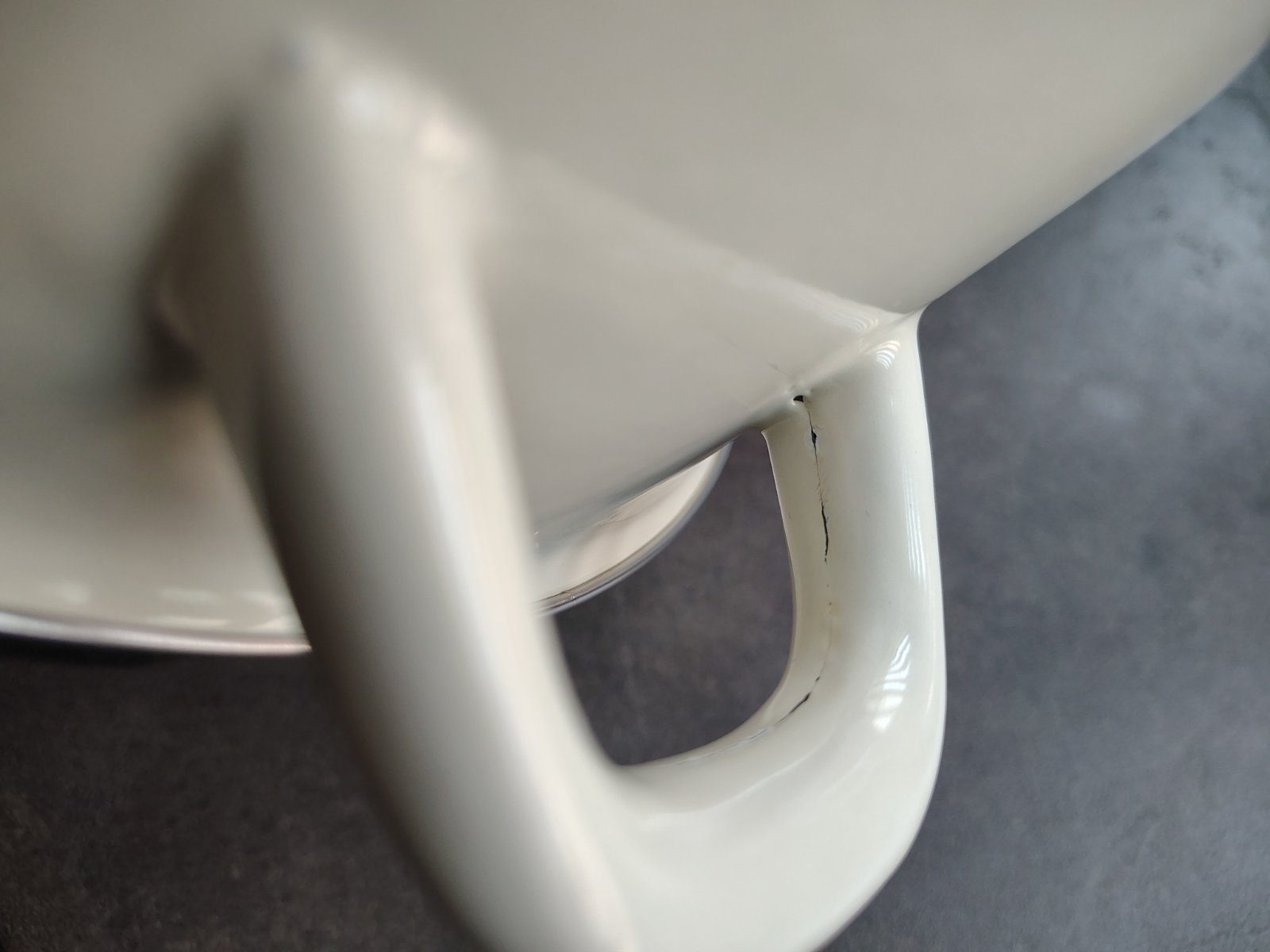 Na tých smaltových hrncoch sú často plechové ušká, ktoré sa proste vylisujú z kusu plechu ohnú do po6adovaného tvaru a privaria k hrncu. Potom sa hrniec ponára do smaltovacej zmesi. To čo je na fotke nie je prasklina ale proste miesto kde sa stretli kraje ohnutého plechu.