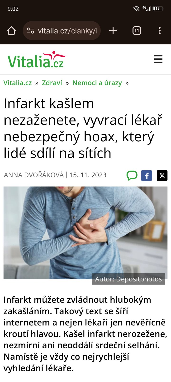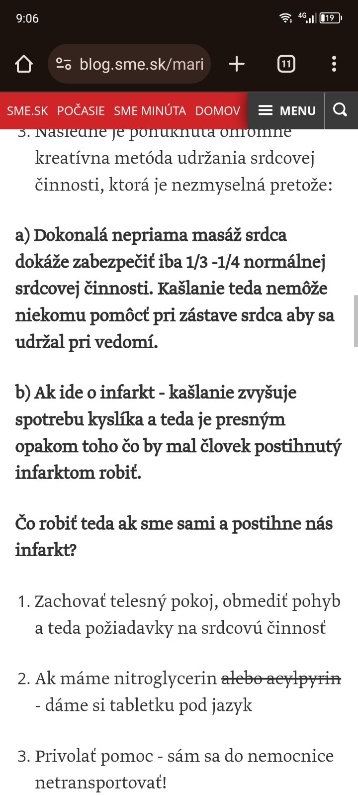 Manžel mal pred 5 rokmi infarkt, bol august horúco. Bolo mu teplo, ako keby mal úpal... Žiadna bolest na hrudi. Nepomohla sprcha. Cítil rýchlejší tep. Po zmeraní tlaku sme predsa len išli na pohotovosť. Tam dali nejakú injekciu, tabletu pod jazyk 🤦🏼♀️ tlak neklesol az na koniec, že urobia EKG. Po natočení okamžite sanitka a smer Prešov na zákrok. Od príznakov po zákrok cca 4 hodiny.