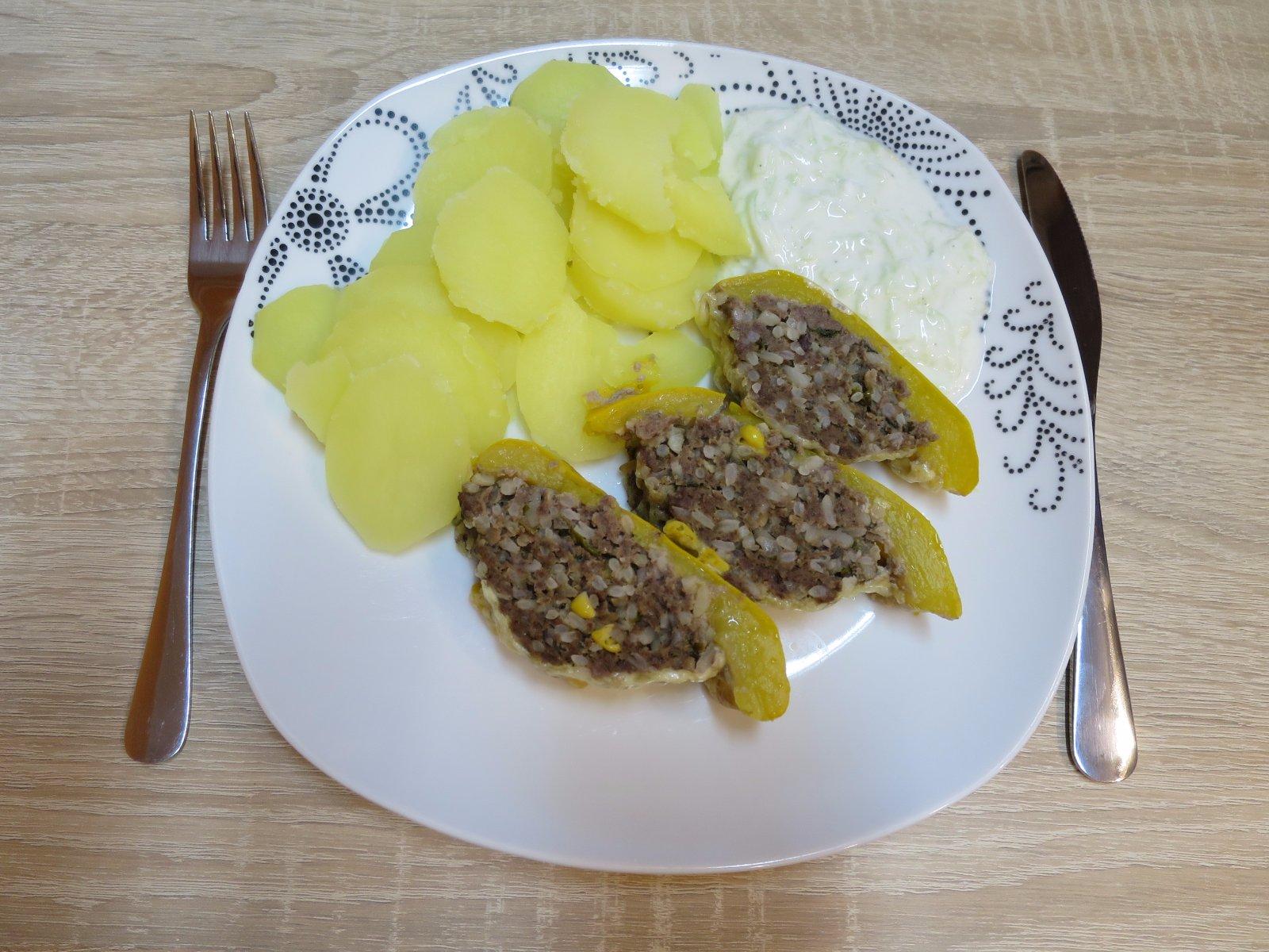 Plnená cuketa, varené zemiaky a uhorkový dip