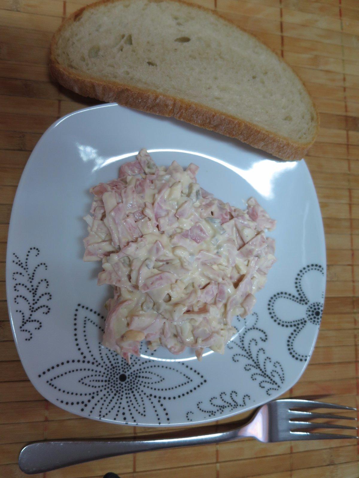 Recept: 500 g jemnej salámy, 6 vajec, sterilizované uhorky, majolka, nátierkové maslo, 1 KL práškového cukru, soľ, čierne korenie, 1PL horčice. Salámu nakrájame na rezance, uvarené vajcia nastrúhame na veľkom strúhadle, uhorky na malé kocky. Všetko dáme do jednej nádoby. Vymiešame téglik majolky s nátierkovým maslom, pridáme práškový cukor, šoľ, čierne korenie a horčicu. Na záver všetko spolu spojíme, prípadne dochutíme a dáme do chladničky.... a papáme.