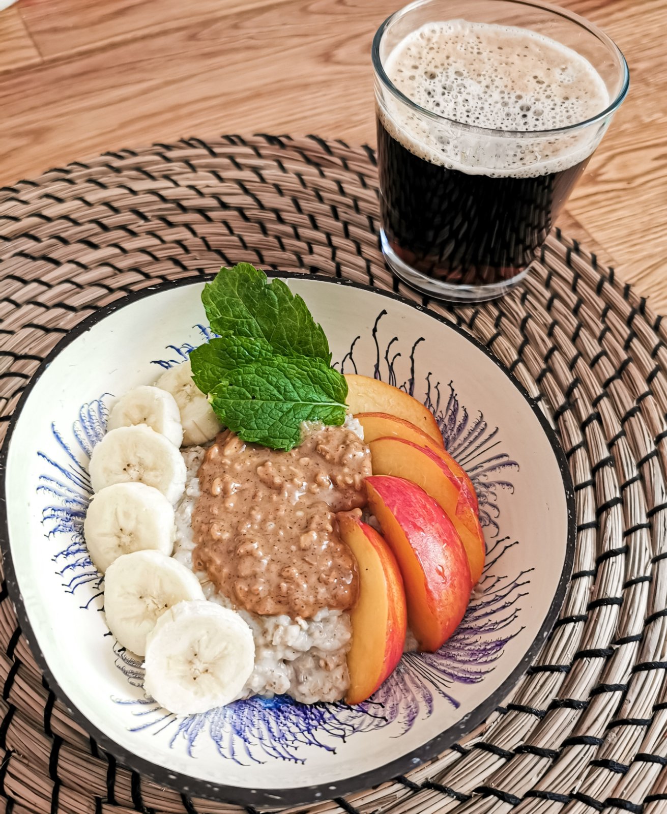 Moje obľúbené a skoro každodenné 😁 raňajky. Ovsene vločky uvarené v mandľovom alebo ovsenom mlieku, k tomu ovocie, lyžica arasidoveho masla a lístky mäty.