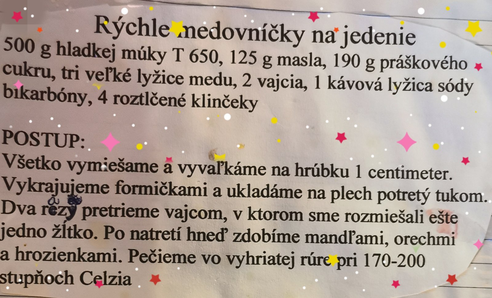 Dievcata moje potrebovala by som fantasticke cesto na medovnicky ...vcera sme totiz skúšali nejake co sme nasli na nete a teda nic moc.... rada by som mala konecne nejake ktore by bolo supwr a ulozila by som si ho na dalsie roky 🙏😉😊