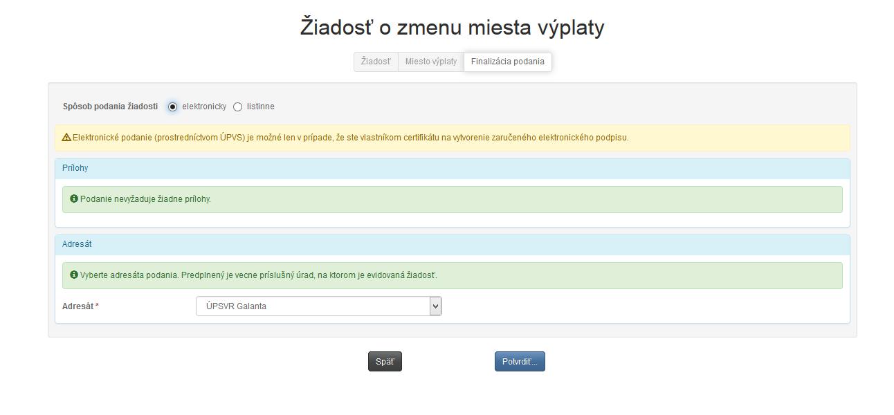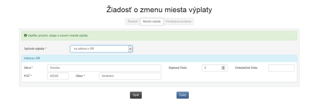 5. Pri aktívnej dávke mám možnosť "Zmeniť miesto výplaty" Po kliknutí na tlačidlo som presmerovaná na formulár s mojimi predvyplnenými dátami, kde na druhej strane formulára mám možnosť uviesť nové miesto výplaty /na adresu alebo na účet/