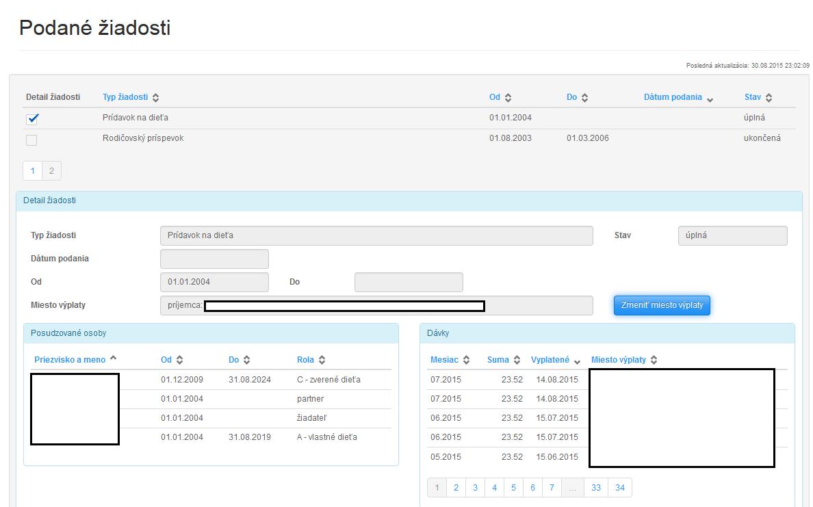 4. Po presmerovaní sa Vám zobrazia všetky Vaše žiadosti a sociálne dávky, ktoré ste niekedy poberali aj s podrobnými info. Pre ilustráciu uvádzam obrázok z môjho prehľadu, pričom som osobné dáta zabielila.